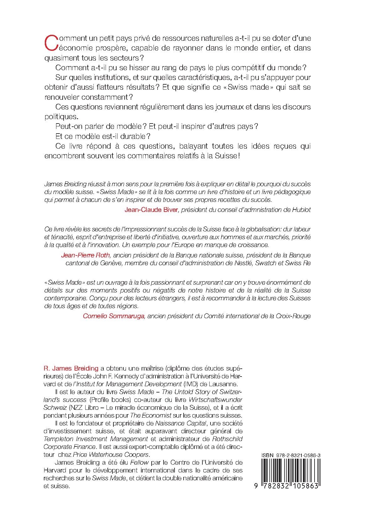 James Breiding réussit à mon sens pour la première fois à expliquer en détail le pourquoi du succès du modèle suisse. «Swiss Made» se lit à la fois comme un livre d’histoire et un livre pédagogique qui permet à chacun de s’en inspirer et de trouver ses propres recettes du succès.