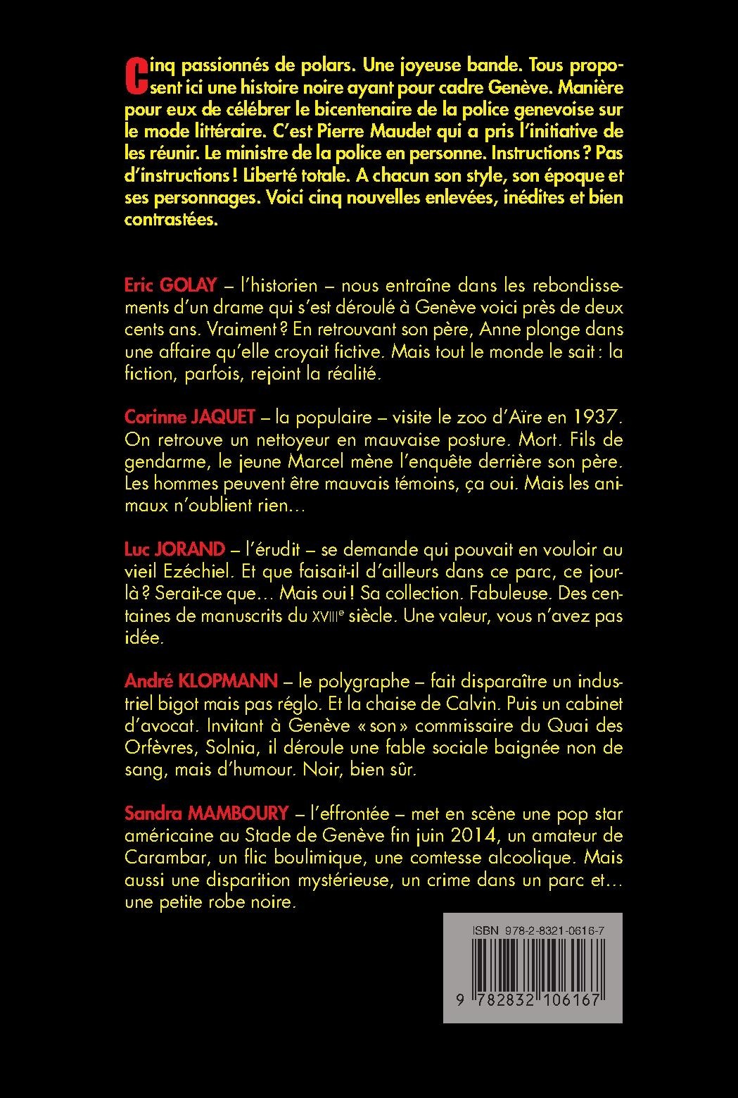 Cinq passionnés de polars. Une joyeuse bande. Tous proposent ici une histoire noire ayant pour cadre Genève. Manière pour eux de célébrer le bicentenaire de la police genevoise sur le mode littéraire. C’est Pierre Maudet qui a pris l’initiative de les réunir. Le ministre de la police en personne. Instructions? Pas d’instructions ! Liberté totale. A chacun son style, son époque et ses personnages. Voici cinq nouvelles enlevées, inédites et bien contrastées.