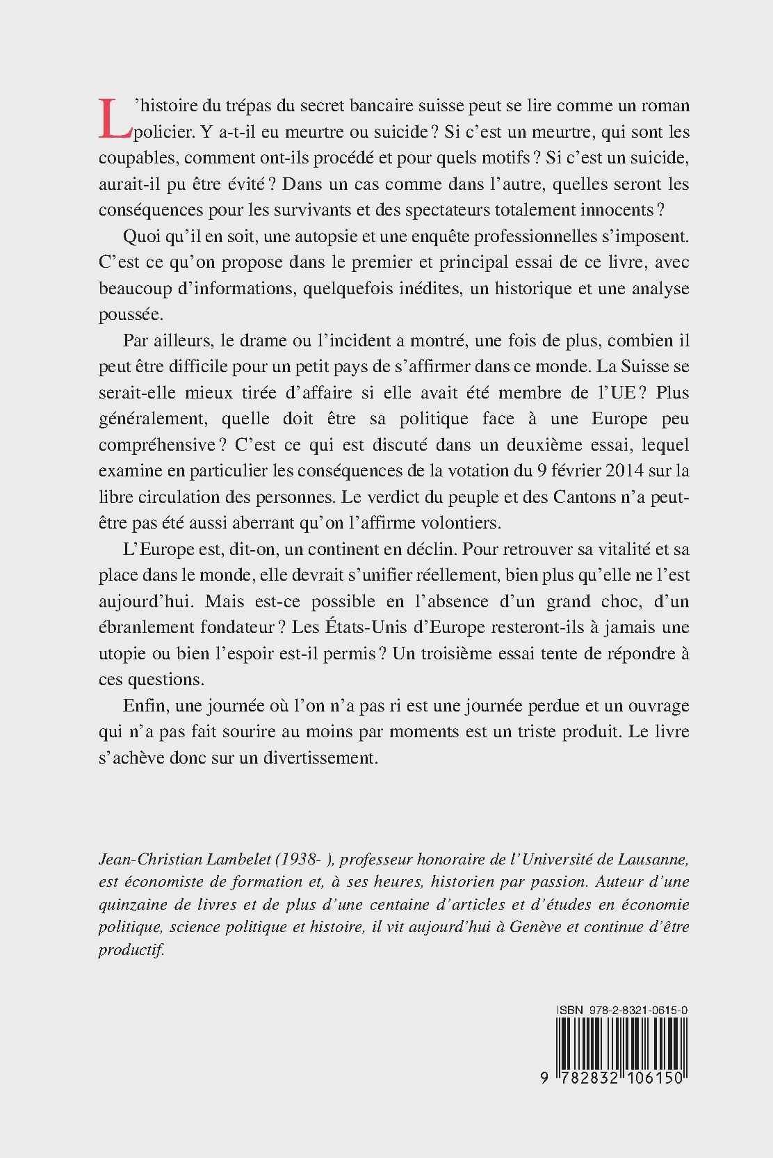 L’histoire du trépas du secret bancaire suisse peut se lire comme un roman policier. Y a-t-il eu meurtre ou suicide ? Si c’est un meurtre, qui sont les coupables, comment ont-ils procédé et pour quels motifs ? Si c’est un suicide, aurait-il pu être évité ? Dans un cas comme dans l’autre, quelles seront les conséquences pour les survivants et des spectateurs totalement innocents ?