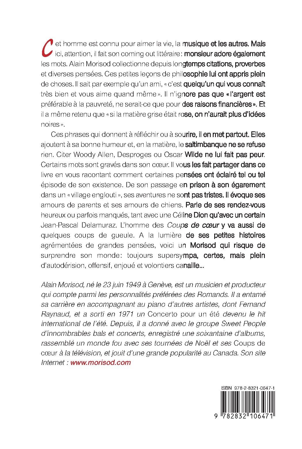 Ces phrases qui donnent à réfléchir ou à sourire, il en met partout. Elles ajoutent à sa bonne humeur et, en la matière, le saltimbanque ne se refuse rien. Citer Woody Allen, Desproges ou Oscar Wilde ne lui fait pas peur. Certains mots sont gravés dans son cœur. Il vous les fait partager dans ce livre en vous racontant comment certaines pensées ont éclairé tel ou tel épisode de son existence. De son passage en prison à son égarement dans un « village englouti », ses aventures ne sont pas tristes. Il évoque ses amours de parents et ses amours de chiens. Parle de ses rendez-vous heureux ou parfois manqués, tant avec une Céline Dion qu’avec un certain Jean-Pascal Delamuraz. L’homme des Coups de cœur y va aussi de quelques coups de gueule. A la lumière de ses petites histoires agrémentées de grandes pensées, voici un Morisod qui risque de surprendre son monde: toujours supersympa, certes, mais plein d’autodérision, offensif, enjoué et volontiers canaille…