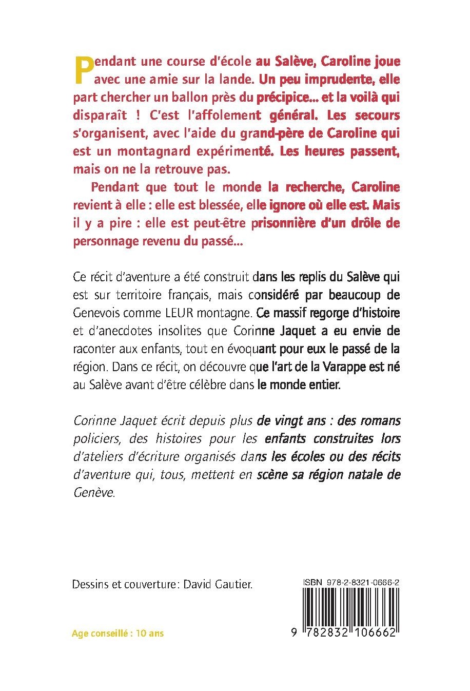 Ce récit d’aventure a été construit dans les replis du Salève qui est sur territoire français, mais considéré par beaucoup de Genevois comme LEUR montagne. Ce massif regorge d’histoire et d’anecdotes insolites que Corinne Jaquet a eu envie de raconter aux enfants, tout en évoquant pour eux le passé de la région. Dans ce récit, on découvre que l’art de la Varappe est né au Salève avant d’être célèbre dans le monde entier.