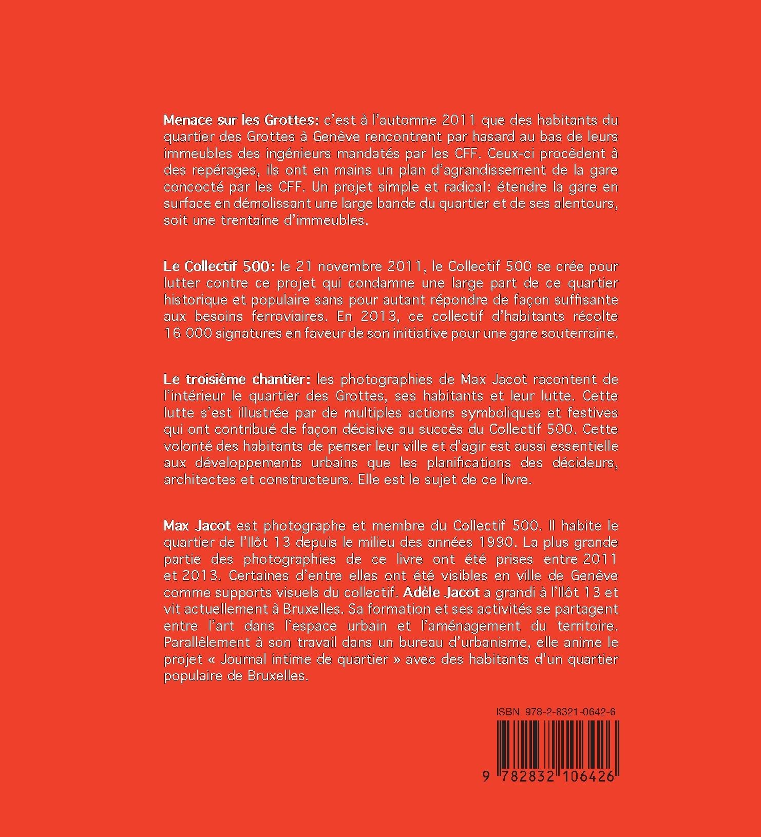 Le troisième chantier : les photographies de Max Jacot racontent de l’intérieur le quartier des Grottes, ses habitants et leur lutte. Cette lutte s’est illustrée par de multiples actions symboliques et festives qui ont contribué de façon décisive au succès du Collectif 500. Cette volonté des habitants de penser leur ville et d’agir est aussi essentielle aux développements urbains que les planifications des décideurs, architectes et constructeurs. Elle est le sujet de ce livre.