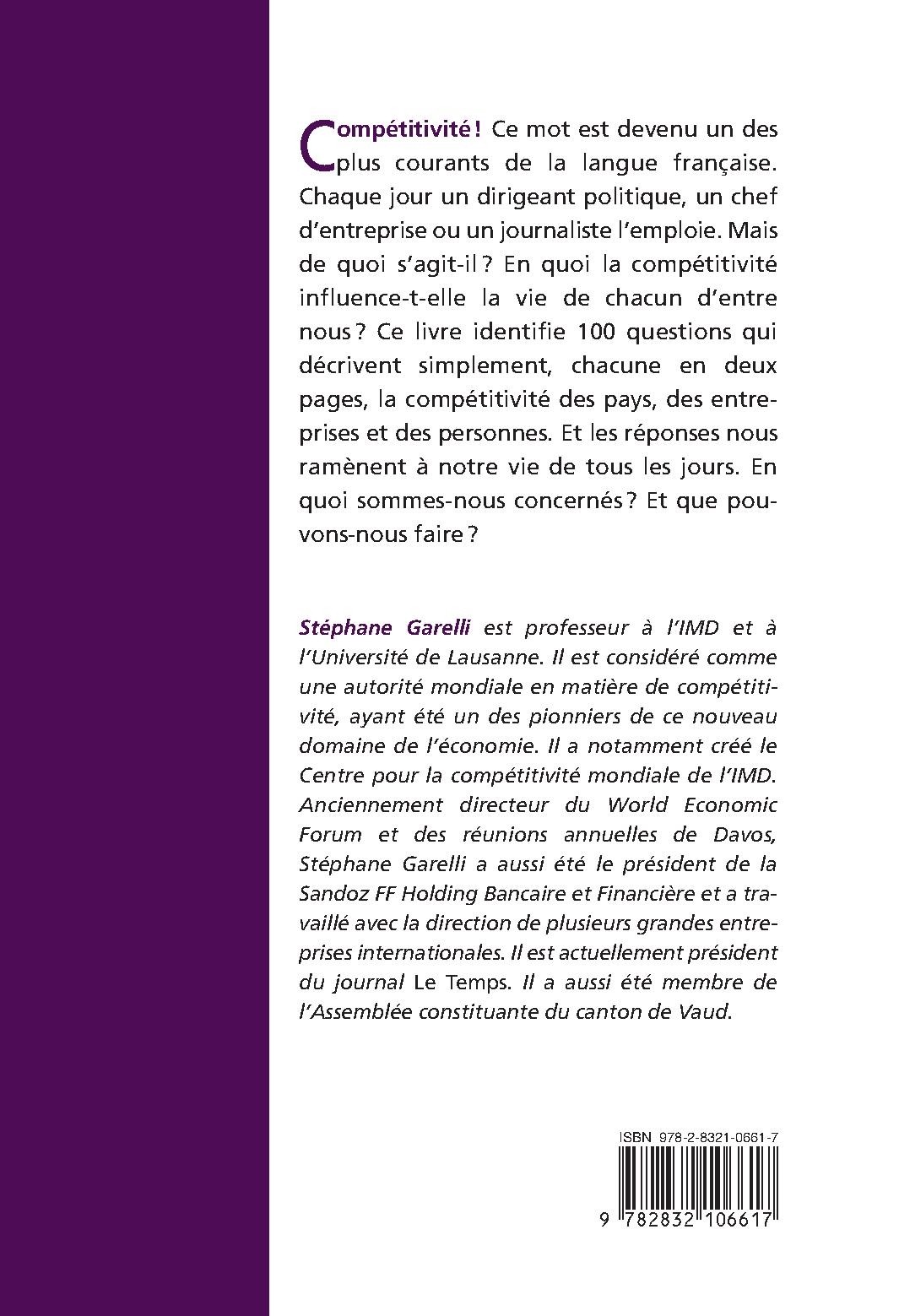 Compétitivité ! Ce mot est devenu un des plus courants de la langue française. Chaque jour un dirigeant politique, un chef d’entreprise ou un journaliste l’emploie. Mais de quoi s’agit-il ? En quoi la compétitivité influence-t-elle la vie de chacun d’entre nous? Ce livre identifie 100 questions qui décrivent simplement, chacune en deux pages, la compétitivité des pays, des entreprises et des personnes. Et les réponses nous ramènent à notre vie de tous les jours. En quoi sommes-nous concernés ? Et que pouvons-nous faire?