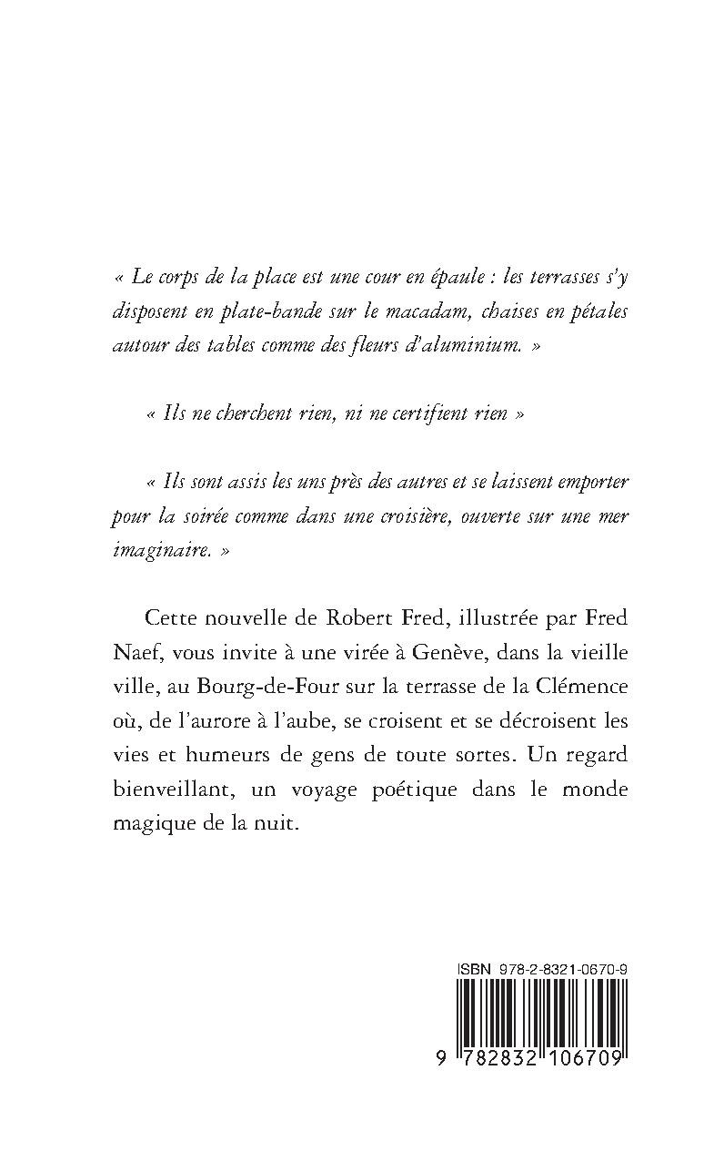 Cette nouvelle de Robert Fred, illustrée par Fred Naef, vous invite à une virée à Genève, dans la vieille ville, au Bourg-de-Four, sur la terrasse de la Clémence où de l’aurore à l’aube se croisent et se décroisent les vies et humeurs de gens de toute sortes. Un regard bienveillant, un voyage poétique dans le monde magique de la nuit.