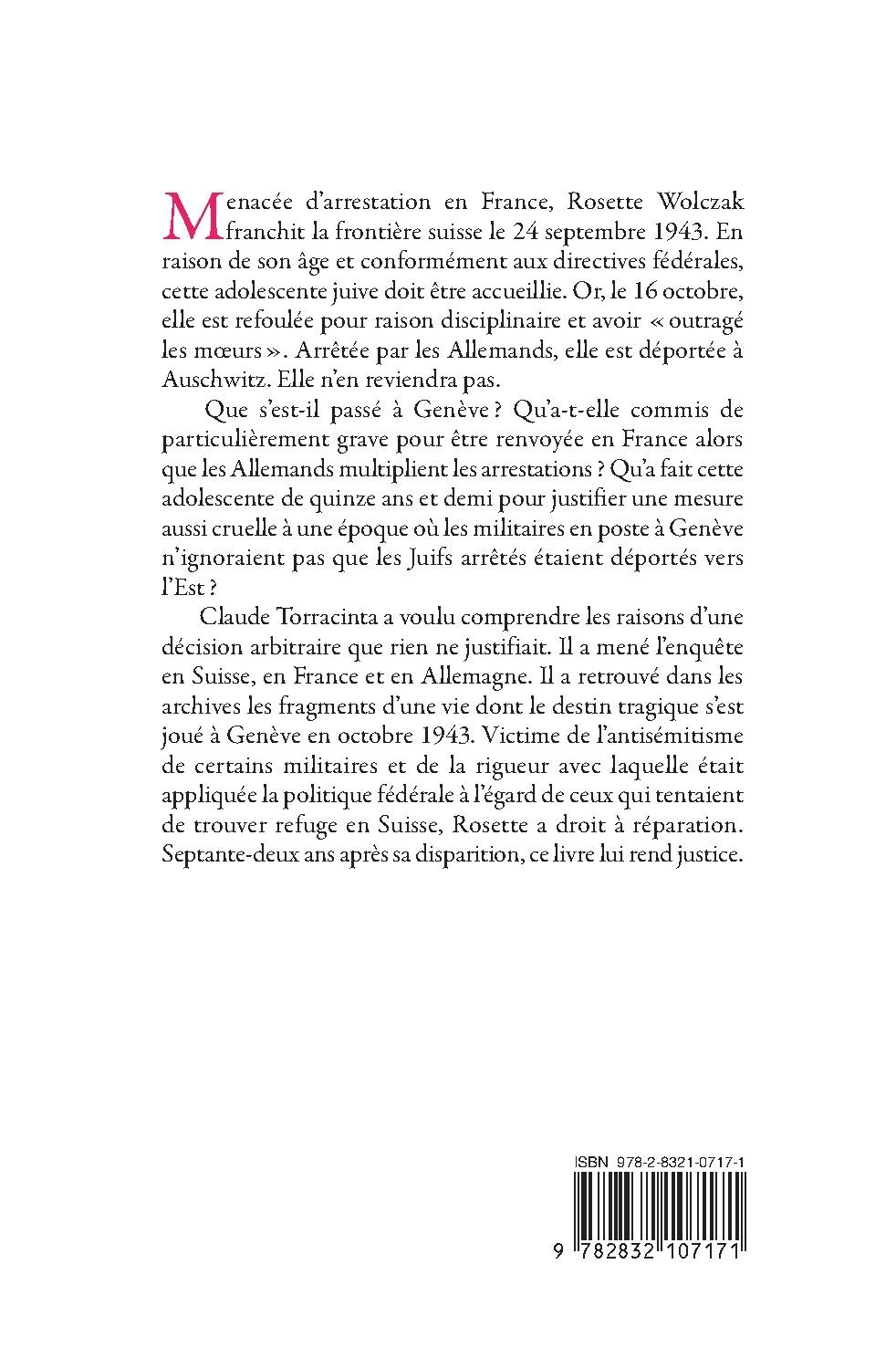 Menacée d’arrestation en France, Rosette Wolczak franchit la frontière suisse le 24 septembre 1943. En raison de son âge et conformément aux directives fédérales, cette adolescente juive doit être accueillie. Or, le 16 octobre, elle est refoulée pour raison disciplinaire et avoir « outragé les mœurs ». Arrêtée par les Allemands, elle est déportée à Auschwitz. Elle n’en reviendra pas. Que s’est-il passé à Genève ? Qu’a-t-elle commis de particulièrement grave pour être renvoyée en France alors que les Allemands multiplient les arrestations ? Qu’a fait cette adolescente de quinze ans et demi pour justifier une mesure aussi cruelle à une époque où les militaires en poste à Genève n’ignoraient pas que les Juifs arrêtés étaient déportés vers l’Est? Claude Torracinta a voulu comprendre les raisons d’une décision arbitraire que rien ne justifiait. Il a mené l’enquête en Suisse, en France et en Allemagne. Il a retrouvé dans les archives les fragments d’une vie dont le destin tragique s’est joué à Genève en octobre 1943. Victime de l’antisémitisme de certains militaires et de la rigueur avec laquelle était appliquée la politique fédérale à l’égard de ceux qui tentaient de trouver refuge en Suisse, Rosette a droit à réparation. Septante-deux ans après sa disparition, ce livre lui rend justice.