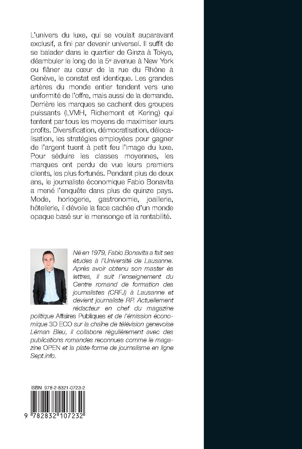 L’univers du luxe, qui se voulait auparavant exclusif, a fini par devenir universel. Il suffit de se balader dans le quartier de Ginza à Tokyo, déambuler le long de la 5e avenue à New York ou flâner au cœur de la rue du Rhône à Genève, le constat est identique. Les grandes artères du monde entier tendent vers une uniformité de l’offre, mais aussi de la demande. Derrière les marques se cachent des groupes puissants (LVMH, Richemont et Kering) qui tentent par tous les moyens de maximiser leurs profits. Diversification, démocratisation, délocalisation, les stratégies employées pour gagner de l’argent tuent à petit feu l’image du luxe. Pour séduire les classes moyennes, les marques ont perdu de vue leurs premiers clients, les plus fortunés. Pendant plus de deux ans, le journaliste économique Fabio Bonavita a mené l’enquête dans plus de quinze pays. Mode, horlogerie, gastronomie, joaillerie, hôtellerie, il dévoile la face cachée d’un monde opaque basé sur le mensonge et la rentabilité.