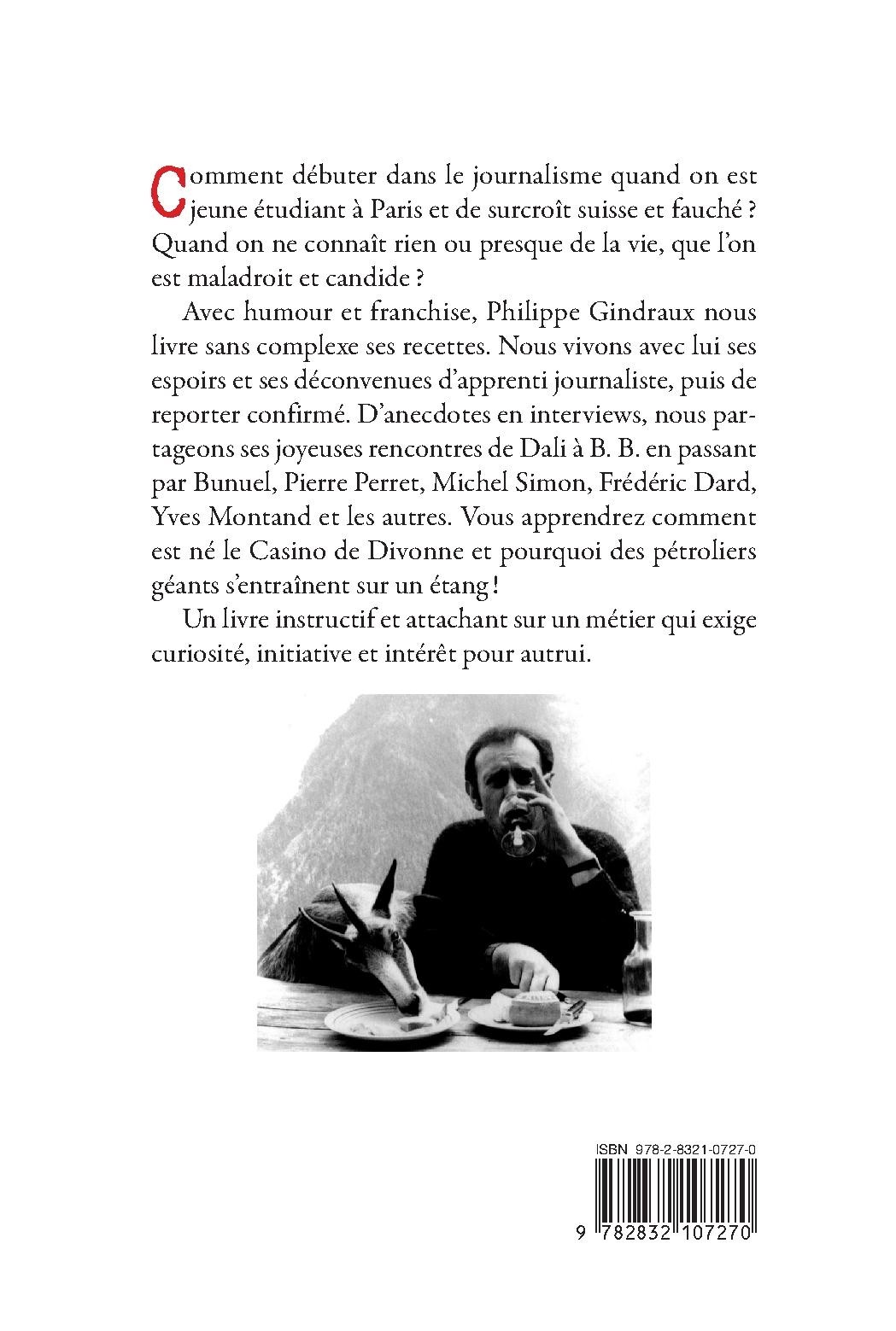 Avec humour et franchise, Philippe Gindraux nous livre sans complexe ses recettes. Nous vivons avec lui ses espoirs et ses déconvenues d’apprenti journaliste, puis de reporter confirmé. D’anecdotes en interviews, nous partageons ses joyeuses rencontres de Dali à B. B. en passant par Bunuel, Pierre Perret, Michel Simon, Frédéric Dard, Yves Montand et les autres. Vous apprendrez comment est né le Casino de Divonne et pourquoi des pétroliers géants s’entraînent sur un étang !