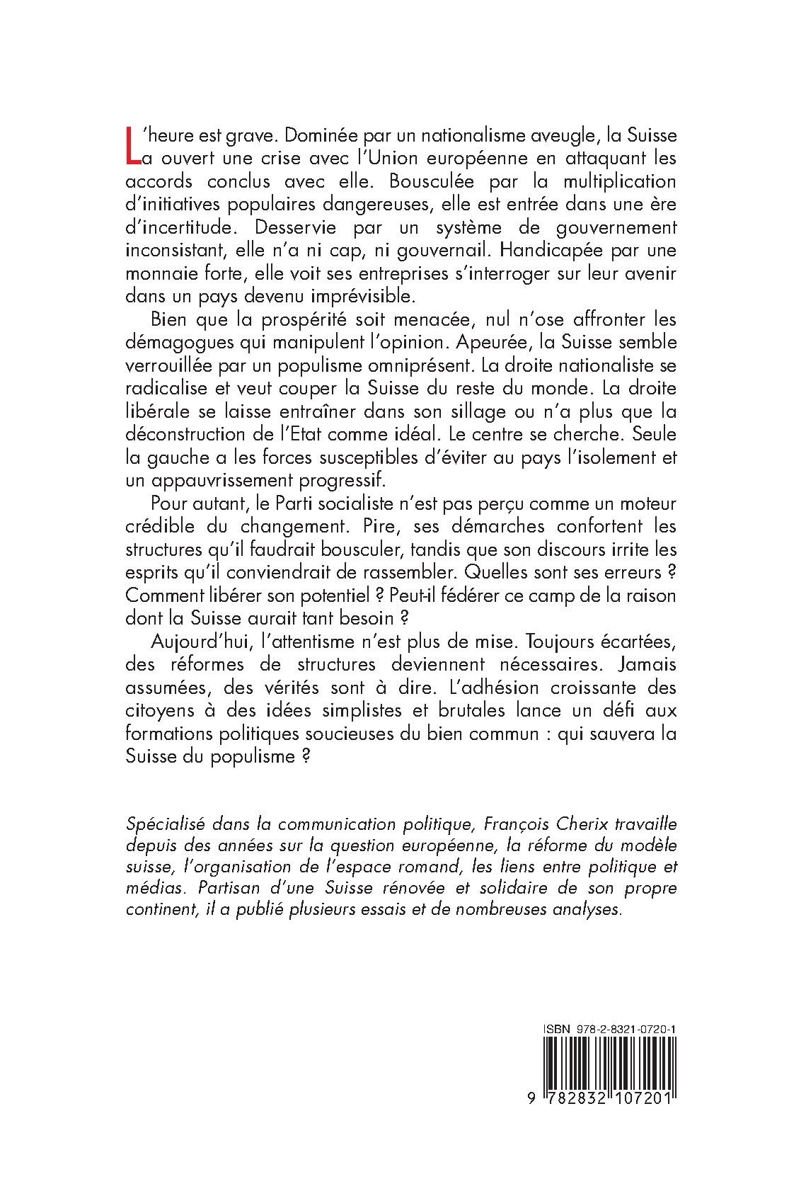 L’heure est grave. Dominée par un nationalisme aveugle, la Suisse a ouvert une crise avec l’Union européenne en attaquant les accords conclus avec elle. Bousculée par la multiplication d’initiatives populaires dangereuses, elle est entrée dans une ère d’incertitude. Desservie par un système de gouvernement inconsistant, elle n’a ni cap, ni gouvernail. Handicapée par une monnaie forte, elle voit ses entreprises s’interroger sur leur avenir dans un pays devenu imprévisible. Bien que la prospérité soit menacée, nul n’ose affronter les démagogues qui manipulent l’opinion. Apeurée, la Suisse semble verrouillée par un populisme omniprésent. La droite nationaliste se radicalise et veut couper la Suisse du reste du monde. La droite libérale se laisse entraîner dans son sillage ou n’a plus que la déconstruction de l’Etat comme idéal. Le centre se cherche. Seule la gauche a les forces susceptibles d’éviter au pays l’isolement et un appauvrissement progressif. Pour autant, le Parti socialiste n’est pas perçu comme un moteur crédible du changement. Pire, ses démarches confortent les structures qu’il faudrait bousculer, tandis que son discours irrite les esprits qu’il conviendrait de rassembler. Quelles sont ses erreurs ? Comment libérer son potentiel ? Peut-il fédérer ce camp de la raison dont la Suisse aurait tant besoin ? Aujourd’hui, l’attentisme n’est plus de mise. Toujours écartées, des réformes de structures deviennent nécessaires. Jamais assumées, des vérités sont à dire. L’adhésion croissante des citoyens à des idées simplistes et brutales lance un défi aux formations politiques soucieuses du bien commun : qui sauvera la Suisse du populisme ?