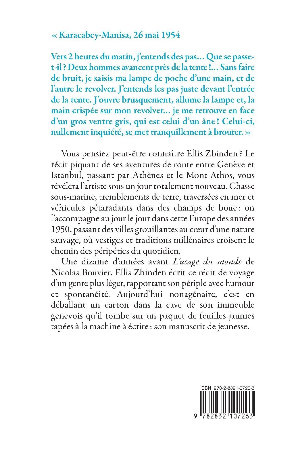 Vous pensiez peut-être connaître Ellis Zbinden ? Le récit piquant de ses aventures de route entre Genève et Istanbul, passant par Athènes et le Mont-Athos, vous révélera l’artiste sous un jour totalement nouveau. Chasse sous-marine, tremblements de terre, traversées en mer et véhicules pétaradants dans des champs de boue : on l’accompagne au jour le jour dans cette Europe des années 1950, passant des villes grouillantes au cœur d’une nature sauvage, où vestiges et traditions millénaires croisent le chemin des péripéties du quotidien. Une dizaine d’années avant L’usage du monde de Nicolas Bouvier, Ellis Zbinden écrit ce récit de voyage d’un genre plus léger, rapportant son périple avec humour et spontanéité. Aujourd’hui nonagénaire, c’est en déballant un carton dans la cave de son immeuble genevois qu’il tombe sur un paquet de feuilles jaunies tapées à la machine à écrire : son manuscrit de jeunesse.