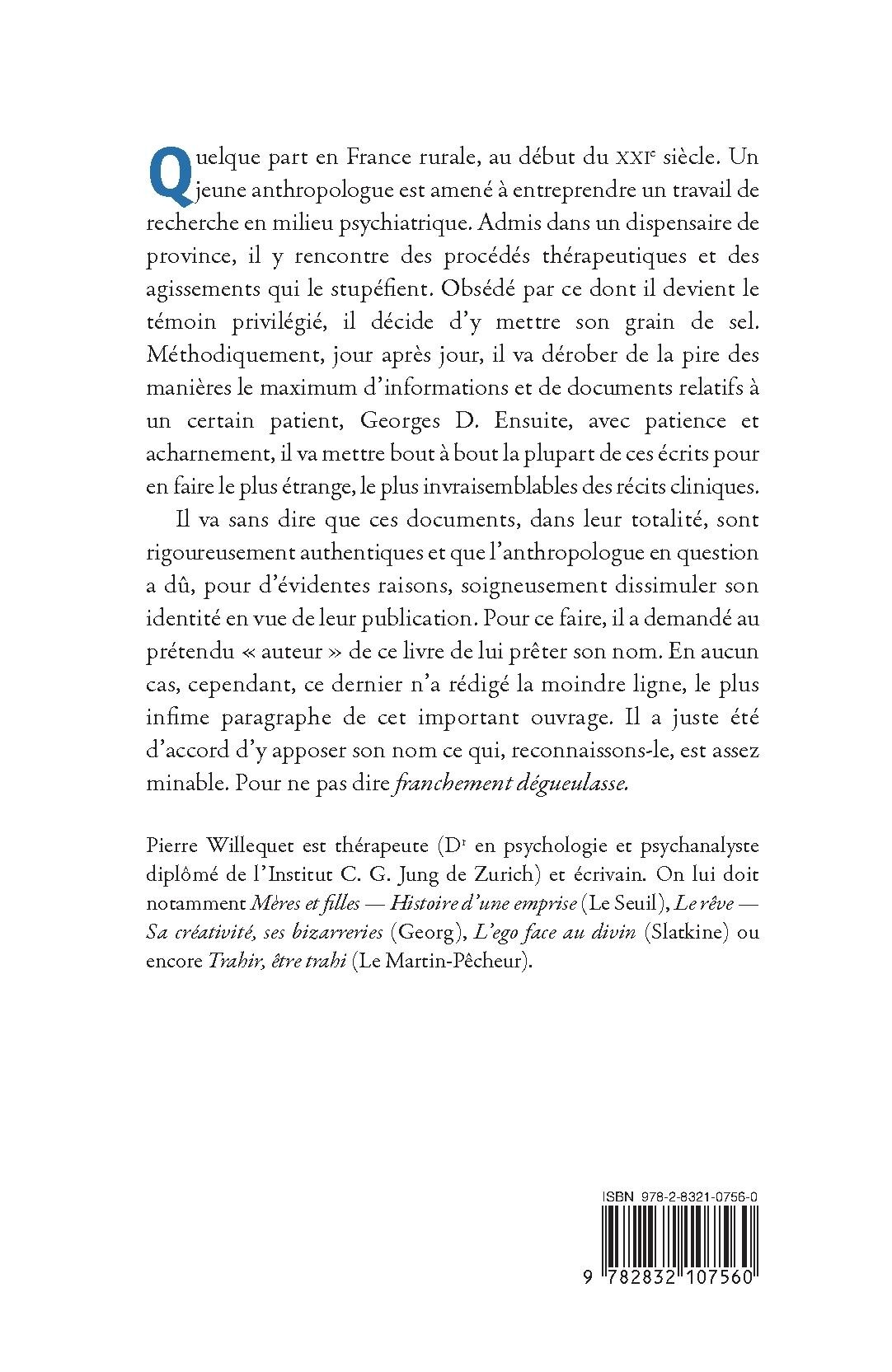 Quelque part en France rurale, au début du XXIe siècle. Un jeune anthropologue est amené à entreprendre un travail de recherche en milieu psychiatrique. Admis dans un dispensaire de province, il y rencontre des procédés thérapeutiques et des agissements qui le stupéfient. Obsédé par ce dont il devient le témoin privilégié, il décide d’y mettre son grain de sel. Méthodiquement, jour après jour, il va dérober de la pire des manières le maximum d’informations et de documents relatifs à un certain patient, Georges D. Ensuite, avec patience et acharnement, il va mettre bout à bout la plupart de ces écrits pour en faire le plus étrange, le plus invraisemblables des récits cliniques.