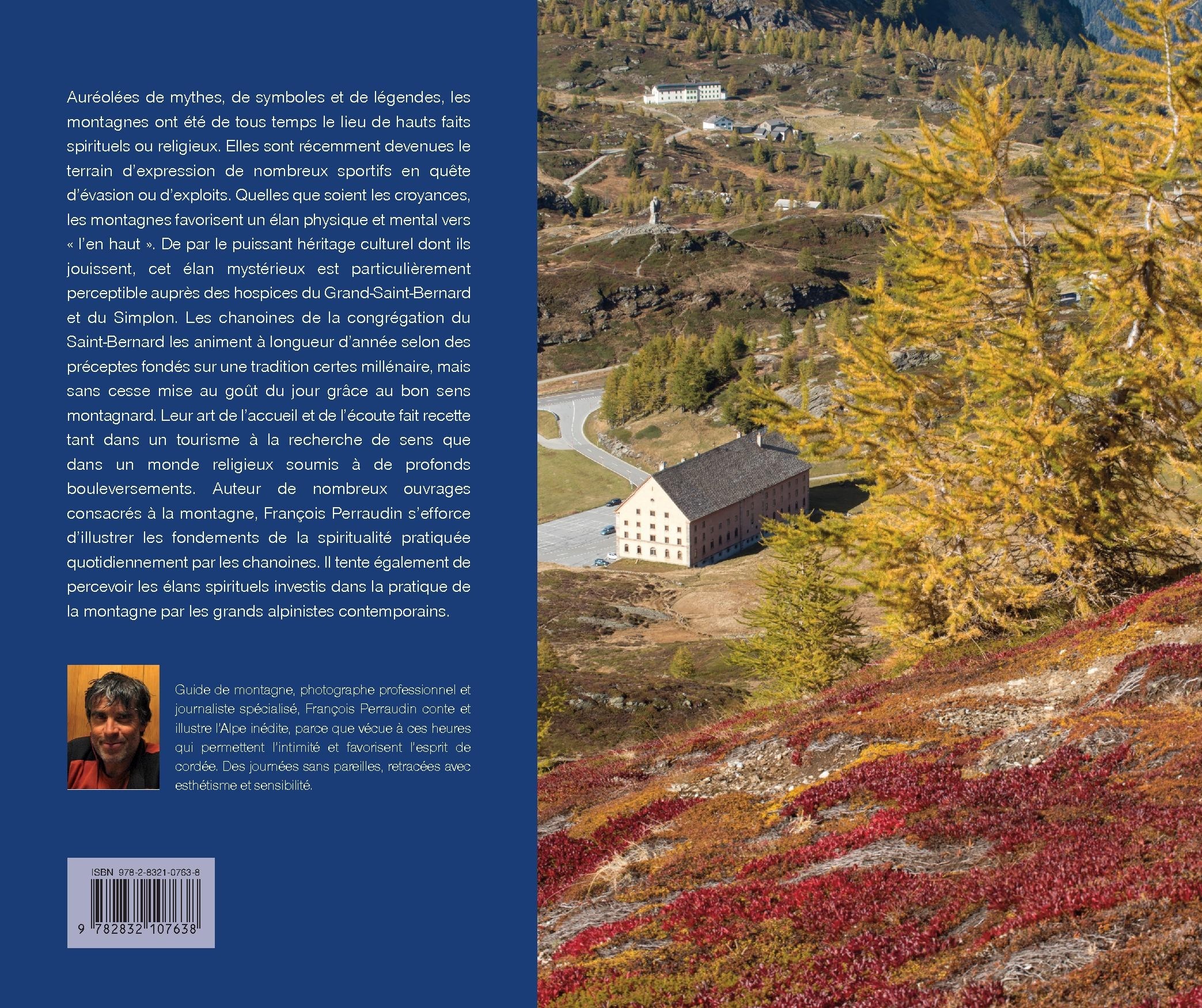 Auréolées de mythes, de symboles et de légendes, les montagnes ont été de tous temps le lieu de hauts faits spirituels ou religieux. Elles sont récemment devenues le terrain d’expression de nombreux sportifs en quête d’évasion ou d’exploits. Quelles que soient les croyances, les montagnes favorisent un élan physique et mental vers « l’en haut ». De par le puissant héritage culturel dont ils jouissent, cet élan mystérieux est particulièrement perceptible auprès des hospices du Grand-Saint-Bernard et du Simplon. Les chanoines de la congrégation du Saint-Bernard les animent à longueur d’année selon des préceptes fondés sur une tradition certes millénaire, mais sans cesse mise au goût du jour grâce au bon sens montagnard. Leur art de l’accueil et de l’écoute fait recette tant dans un tourisme à la recherche de sens que dans un monde religieux soumis à de profonds bouleversements. Auteur de nombreux ouvrages consacrés à la montagne, François Perraudin s’efforce d’illustrer les fondements de la spiritualité pratiquée quotidiennement par les chanoines. Il tente également de percevoir les élans spirituels investis dans la pratique de la montagne par les grands alpinistes contemporains.