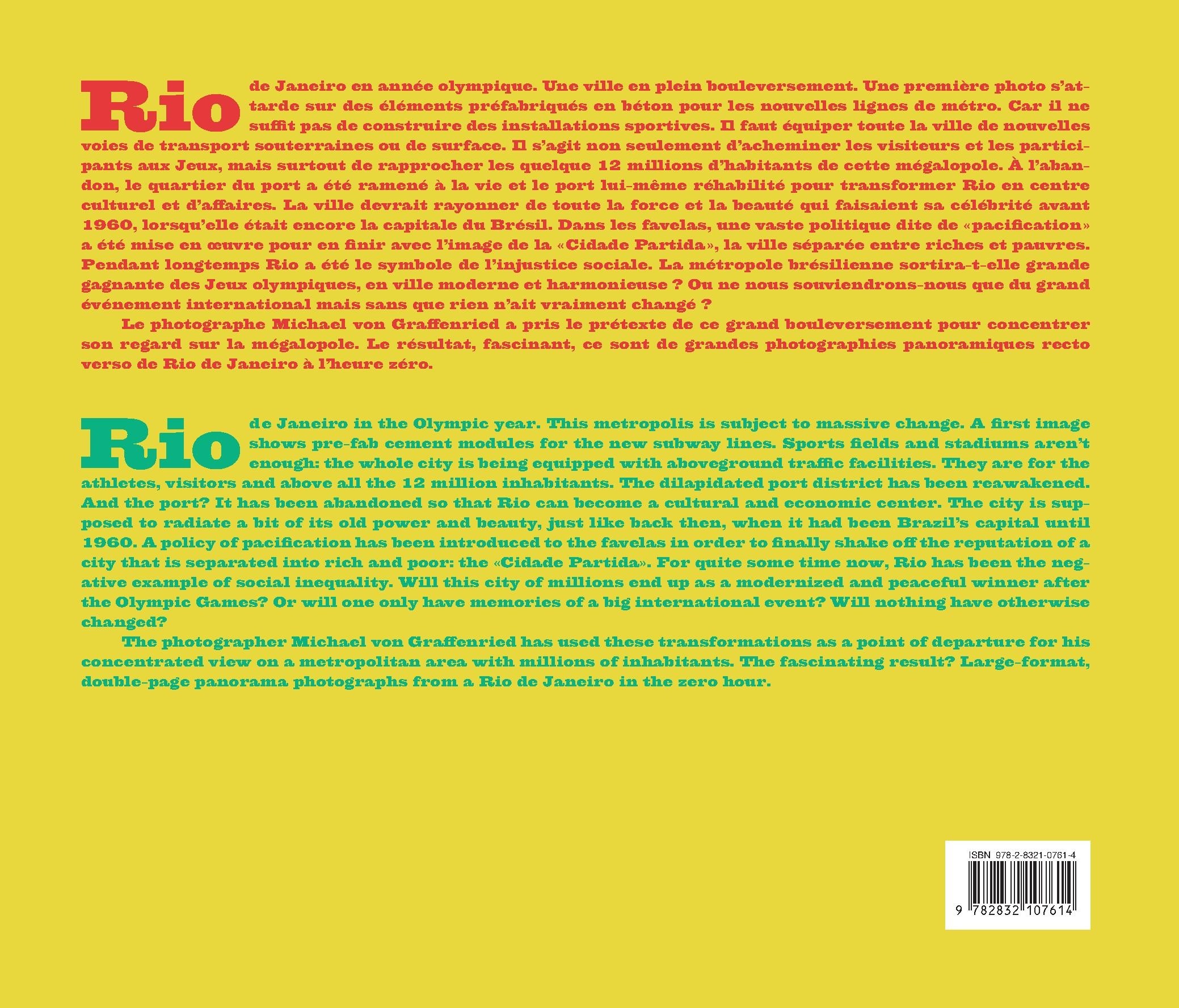 Rio de Janeiro en année olympique. Une ville en plein bouleversement. Une première photo s’attarde sur des éléments préfabriqués en béton pour les nouvelles lignes de métro. Car il ne suffit pas de construire des installations sportives. Il faut équiper toute la ville de nouvelles voies de transport souterraines ou de surface. Il s’agit non seulement d’acheminer les visiteurs et les participants aux Jeux, mais surtout de rapprocher les quelque 12 millions d’habitants de cette mégalopole. À l’abandon, le quartier du port a été ramené à la vie et le port lui-même réhabilité pour transformer Rio en centre culturel et d’affaires. La ville devrait rayonner de toute la force et la beauté qui faisaient sa célébrité avant 1960, lorsqu’elle était encore la capitale du Brésil. Dans les favelas, une vaste politique dite de « pacification » a été mise en œuvre pour en finir avec l’image de la « Cidade Partida », la ville séparée entre riches et pauvres. Pendant longtemps Rio a été le symbole de l’injustice sociale. La métropole brésilienne sortira-t-elle grande gagnante des Jeux olympiques, en ville moderne et harmonieuse ? Ou ne nous souviendrons-nous que du grand événement international mais sans que rien n’ait vraiment changé ? Le photographe Michael von Graffenried a pris le prétexte de ce grand bouleversement pour concentrer son regard sur la mégalopole. Le résultat, fascinant, ce sont de grandes photographies panoramiques recto verso de Rio de Janeiro à l’heure zéro.