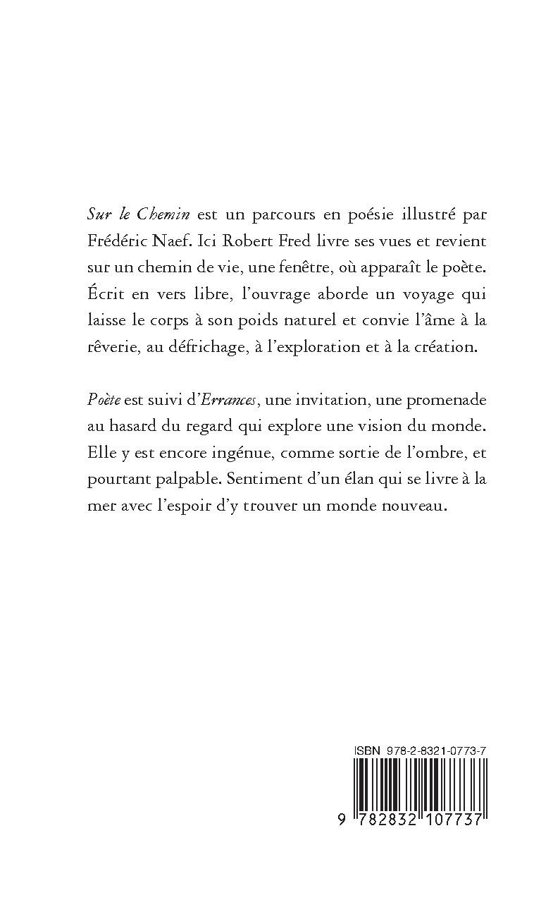 Sur le Chemin est un parcours en poésie illustré par Frédéric Naef. Ici Robert Fred livre ses vues et revient sur un chemin de vie, une fenêtre, où apparaît le poète. Écrit en vers libre, l’ouvrage aborde un voyage qui laisse le corps à son poids naturel et convie l’âme à la rêverie, au défrichage, à l’exploration et à la création.