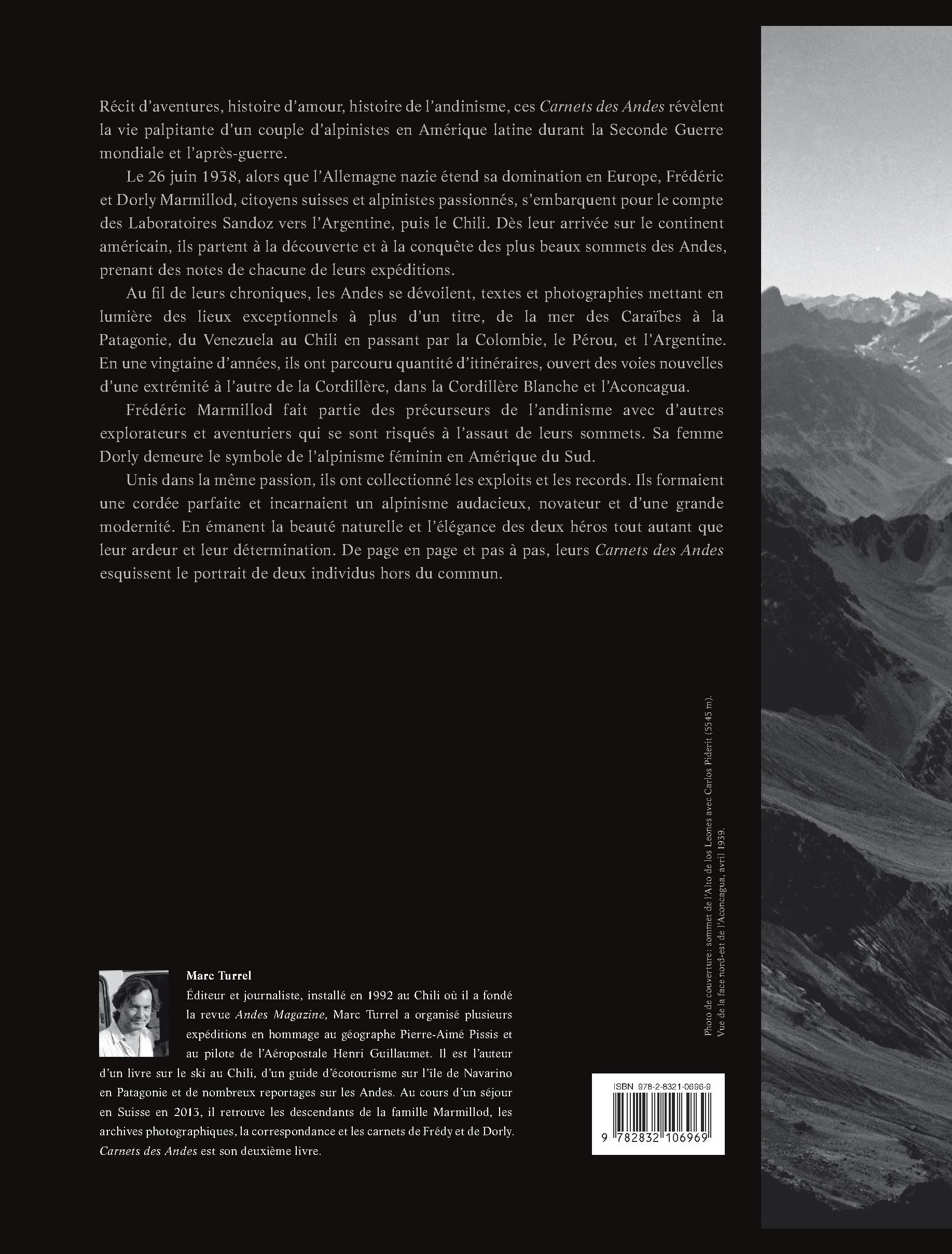 Marc Turrel Éditeur et journaliste, installé en 1992 au Chili où il a fondé la revue Andes Magazine, Marc Turrel a organisé plusieurs expéditions en hommage au géographe Pierre-Aimé Pissis et au pilote de l’Aéropostale Henri Guillaumet. Il est l’auteur d’un livre sur le ski au Chili, d’un guide d’écotourisme sur l’île de Navarino en Patagonie et de nombreux reportages sur les Andes. Au cours d’un séjour en Suisse en 2013, il retrouve les descendants de la famille Marmillod, les archives photographiques, la correspondance et les carnets de Frédy et de Dorly. Carnets des Andes est son deuxième livre.