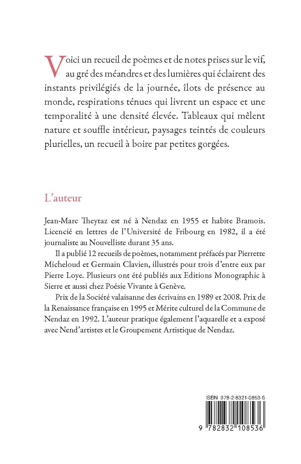 Jean-?Marc Theytaz est né à Nendaz en 1955 et habite Bramois. Licencié en lettres de l'Université de Fribourg en 1982, il a été journaliste au Nouvelliste durant trente-?cinq ans. Il a publié douze recueils de poèmes, notamment préfacés par Pierrette Micheloud et Germain Clavien, illustrés pour trois d'entre eux par Pierre Loye. Plusieurs ont été publiés aux éditions Monographic à Sierre et aussi chez Poésie Vivante à Genève. Prix de la Société valaisanne des écrivains en 1989 et 2008. Prix de la Renaissance francaise en 1995 et Mérite culturel de la Commune de Nendaz en 1992. L'auteur pratique également l'aquarelle et a exposé avec Nend'artistes et le groupement Artistique de Nendaz.