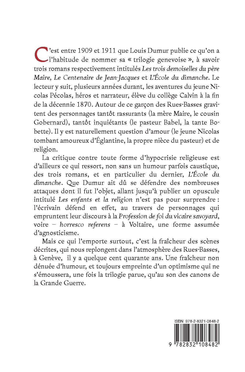 C’est entre 1909 et 1911 que Louis Dumur publie ce qu’on a l’habitude de nommer sa « trilogie genevoise », à savoir trois romans respectivement intitulés Les trois demoiselles du père Maire, Le Centenaire de Jean-Jacques et L’École du dimanche. Le lecteur y suit, plusieurs années durant, les aventures du jeune Nicolas Pécolas, héros et narrateur, élève du collège Calvin à la fin de la décennie 1870. Autour de ce garçon des Rues-Basses gravitent des personnages tantôt rassurants (la mère Maire, le cousin Gobernard), tantôt inquiétants (le pasteur Babel, la tante Bobette). Il y est naturellement question d’amour (le jeune Nicolas tombant amoureux d’Églantine, la propre nièce du pasteur) et de religion.