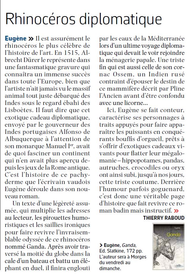 Ganda, c’est l’histoire folle d’un rhinocéros parti d’Inde pour rejoindre la ménagerie du roi Manuel Ier du Portugal, en caravelle! Un cadeau diplomatique de deux tonnes et demie qui ne passe pas inaperçu et aiguise les imaginations…