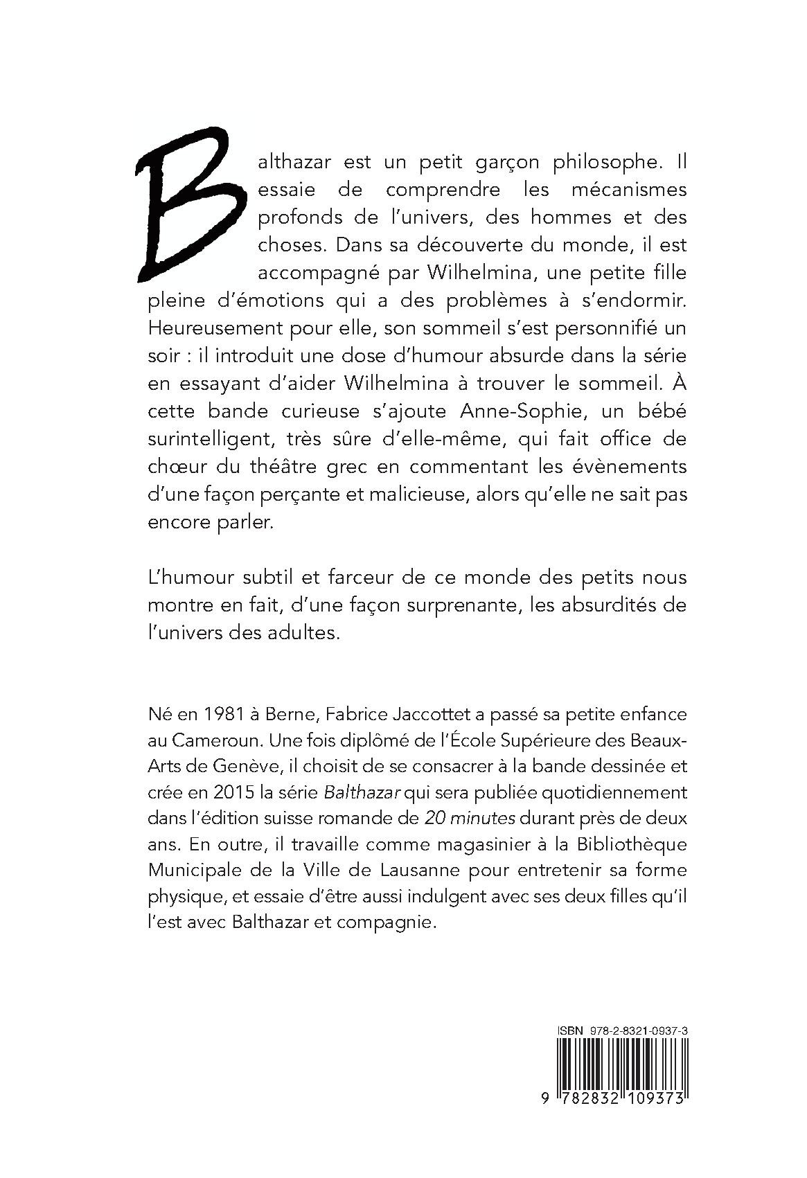 Né en 1981 à Berne, Fabrice Jaccottet a passé sa petite enfance au Cameroun. Une fois diplômé de l’École Supérieure des Beaux-Arts de Genève, il choisit de se consacrer à la bande dessinée et crée en 2015 la série Balthazar qui sera publiée quotidiennement dans l’édition suisse romande de 20 Minutes durant près de deux ans. En outre, il travaille comme magasinier à la Bibliothèque Municipale de la Ville de Lausanne pour entretenir sa forme physique, et essaie d’être aussi indulgent avec ses deux filles qu’il l’est avec Balthazar et compagnie.