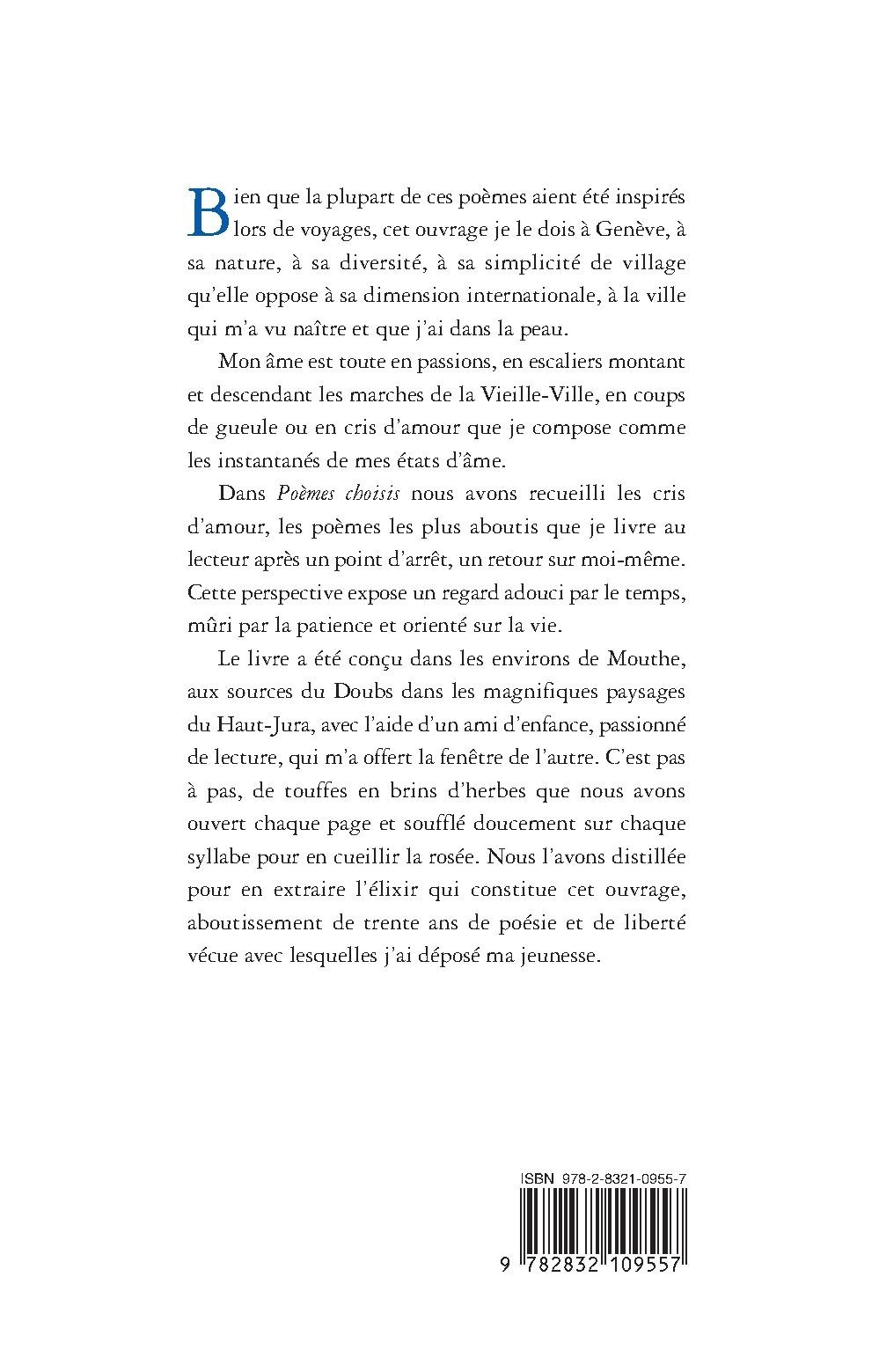 Dans Poèmes choisis nous avons recueilli les cris d’amour, les poèmes les plus aboutis que je livre au lecteur après un point d’arrêt, un retour sur moi-même. Cette perspective expose un regard adouci par le temps, mûri par la patience et orienté sur la vie.