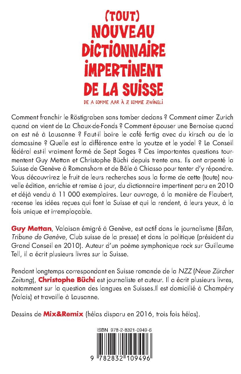 Comment franchir le Röstigraben sans tomber dedans ? Comment aimer Zurich quand on vient de La Chaux-de-Fonds ? Comment épouser une Bernoise quand on est né à Lausanne ? Faut-il boire le café fertig avec du kirsch ou de la damassine ? Quelle est la différence entre la youtze et le yodel ? Le Conseil fédéral est-il vraiment formé de Sept Sages ? Ces importantes questions tourmentent Guy Mettan et Christophe Büchi depuis trente ans. Ils ont arpenté la Suisse de Genève à Romanshorn et de Bâle à Chiasso pour tenter d’y répondre. Vous découvrirez le fruit de leurs recherches sous la forme de cette (toute) nouvelle édition, enrichie et remise à jour, du dictionnaire impertinent paru en 2010 et déjà vendu à 11 000 exemplaires. Leur ouvrage, à la manière de Flaubert, recense les idées reçues qui font la Suisse et qui la rendent, à leurs yeux, à la fois unique et irremplaçable.