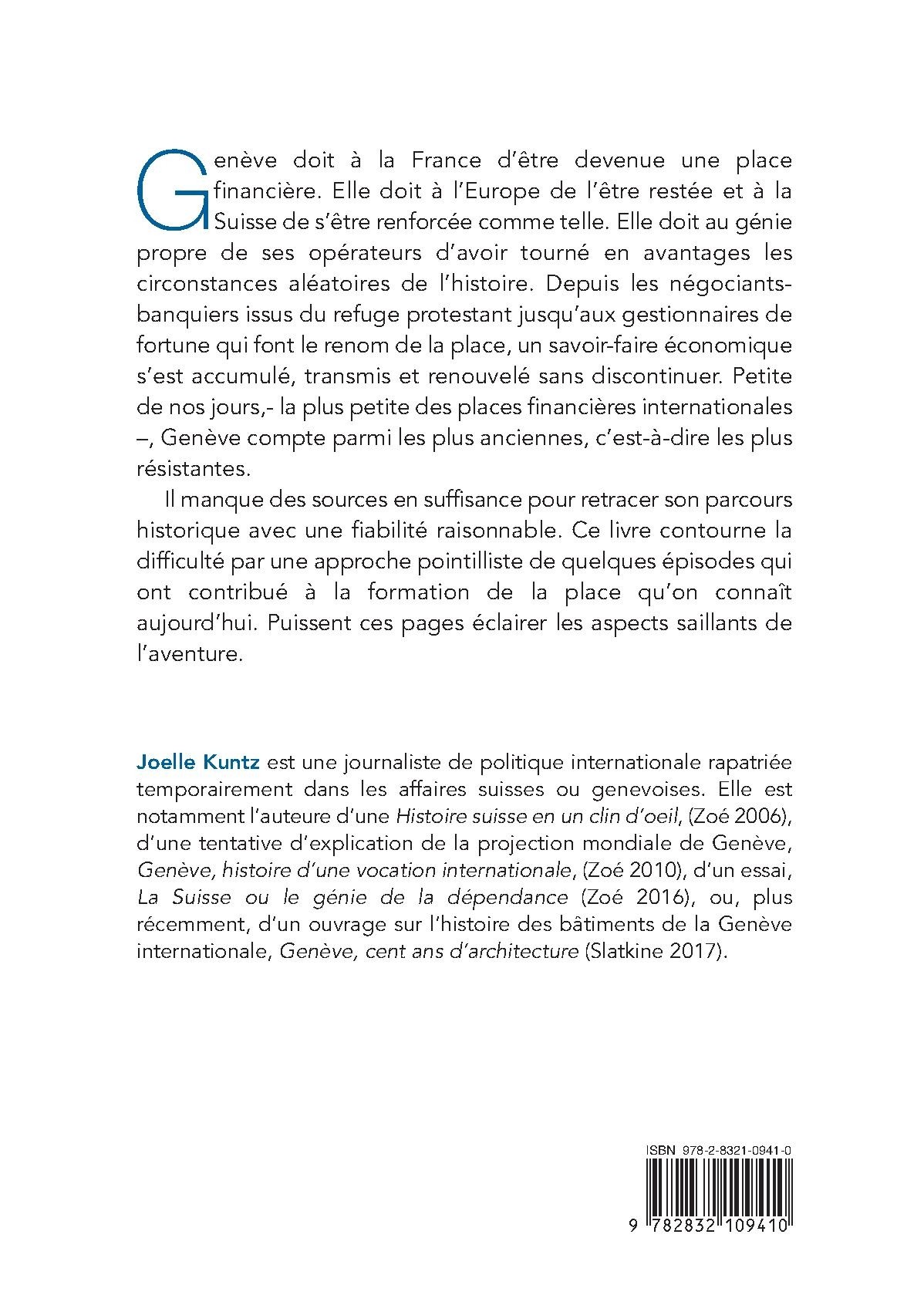 Genève doit à la France d’être devenue une place financière. Elle doit à l’Europe de l’être restée et à la Suisse de s’être renforcée comme telle. Elle doit au génie propre de ses opérateurs d’avoir tourné en avantages les circonstances aléatoires de l’histoire. Depuis les négociants-banquiers issus du refuge protestant jusqu’aux gestionnaires de fortune qui font le renom de la place, un savoir-faire économique s’est accumulé, transmis et renouvelé sans discontinuer. Petite de nos jours,- la plus petite des places financières internationales –, Genève compte parmi les plus anciennes, c’est-à-dire les plus résistantes.