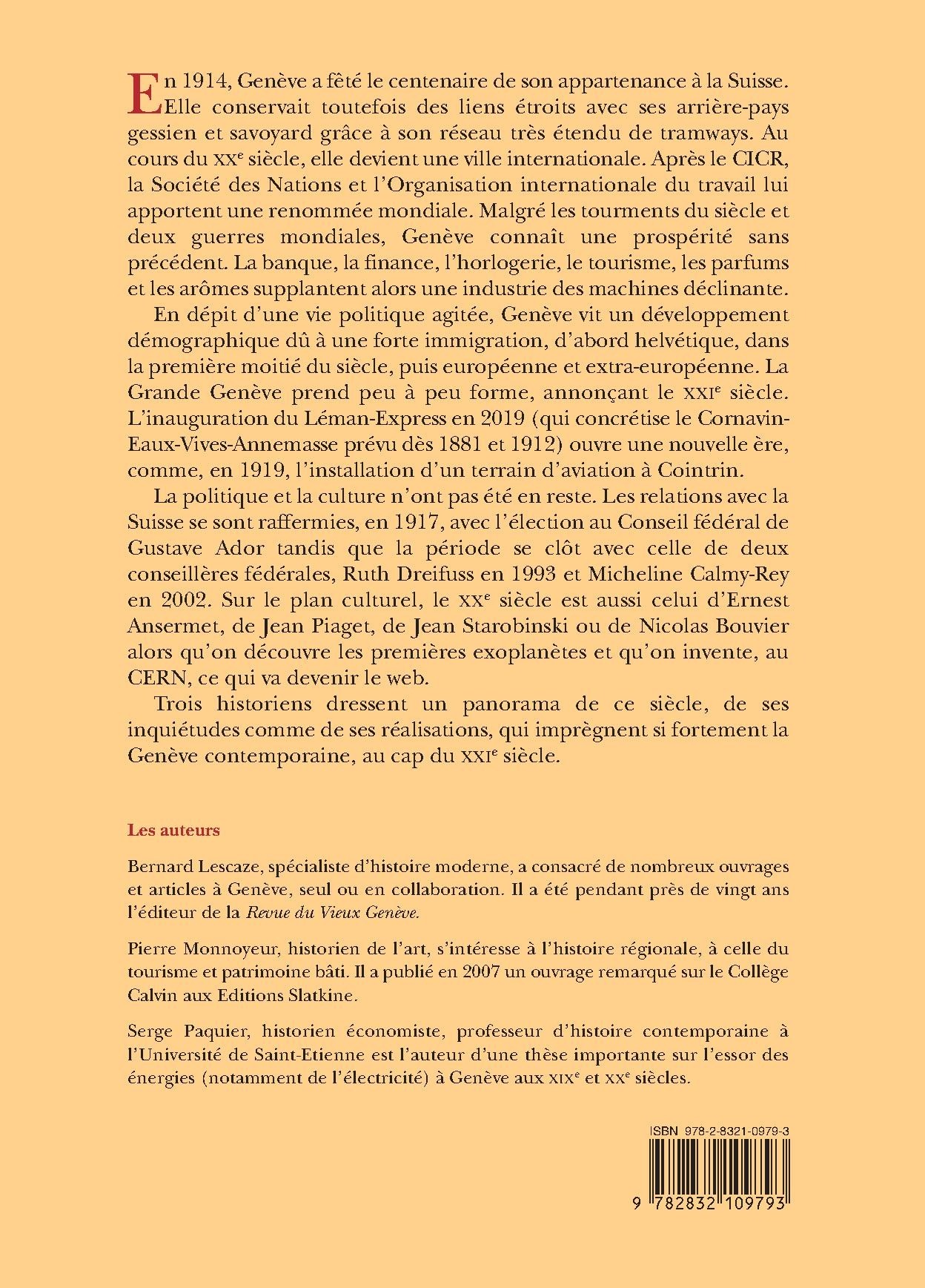 Trois historiens dressent un panorama de ce siècle, de ses inquiétudes comme de ses réalisations, qui imprègnent si fortement la Genève contemporaine, au cap du XXIe siècle.