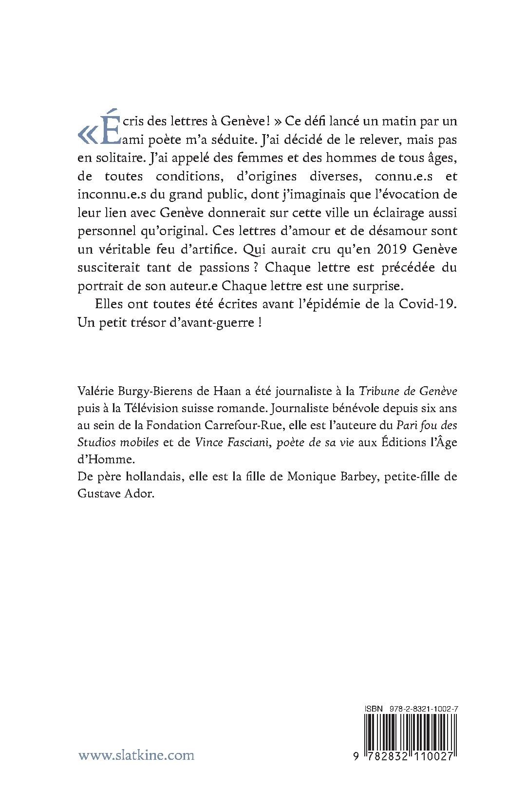 «Écris des lettres à Genève ! » Ce défi lancé un matin par un ami poète m’a séduite. J’ai décidé de le relever, mais pas en solitaire. J’ai appelé des femmes et des hommes de tous âges, de toutes conditions, d’origines diverses, connu.e.s et inconnu.e.s du grand public, dont j’imaginais que l’évocation de leur lien avec Genève donnerait sur cette ville un éclairage aussi personnel qu’original. Ces lettres d’amour et de désamour sont un véritable feu d’artifice. Qui aurait cru qu’en 2019 Genève susciterait tant de passions ? Chaque lettre est précédée du portrait de son auteur.e Chaque lettre est une surprise. Elles ont toutes été écrites avant l’épidémie de la Covid-19.