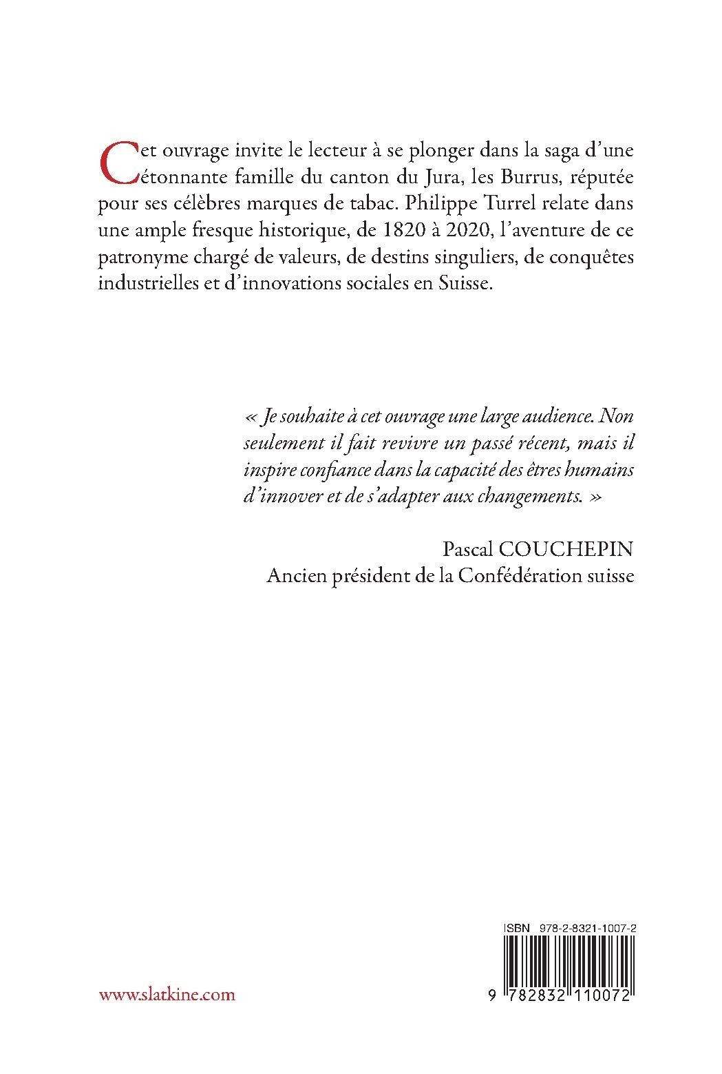 Cet ouvrage invite le lecteur à se plonger dans la saga d’une étonnante famille du canton du Jura, les Burrus, réputée pour ses célèbres marques de tabac. Philippe Turrel relate dans une ample fresque historique, de 1820 à 2020, l’aventure de ce patronyme chargé de valeurs, de destins singuliers, de conquêtes industrielles et d’innovations sociales en Suisse.