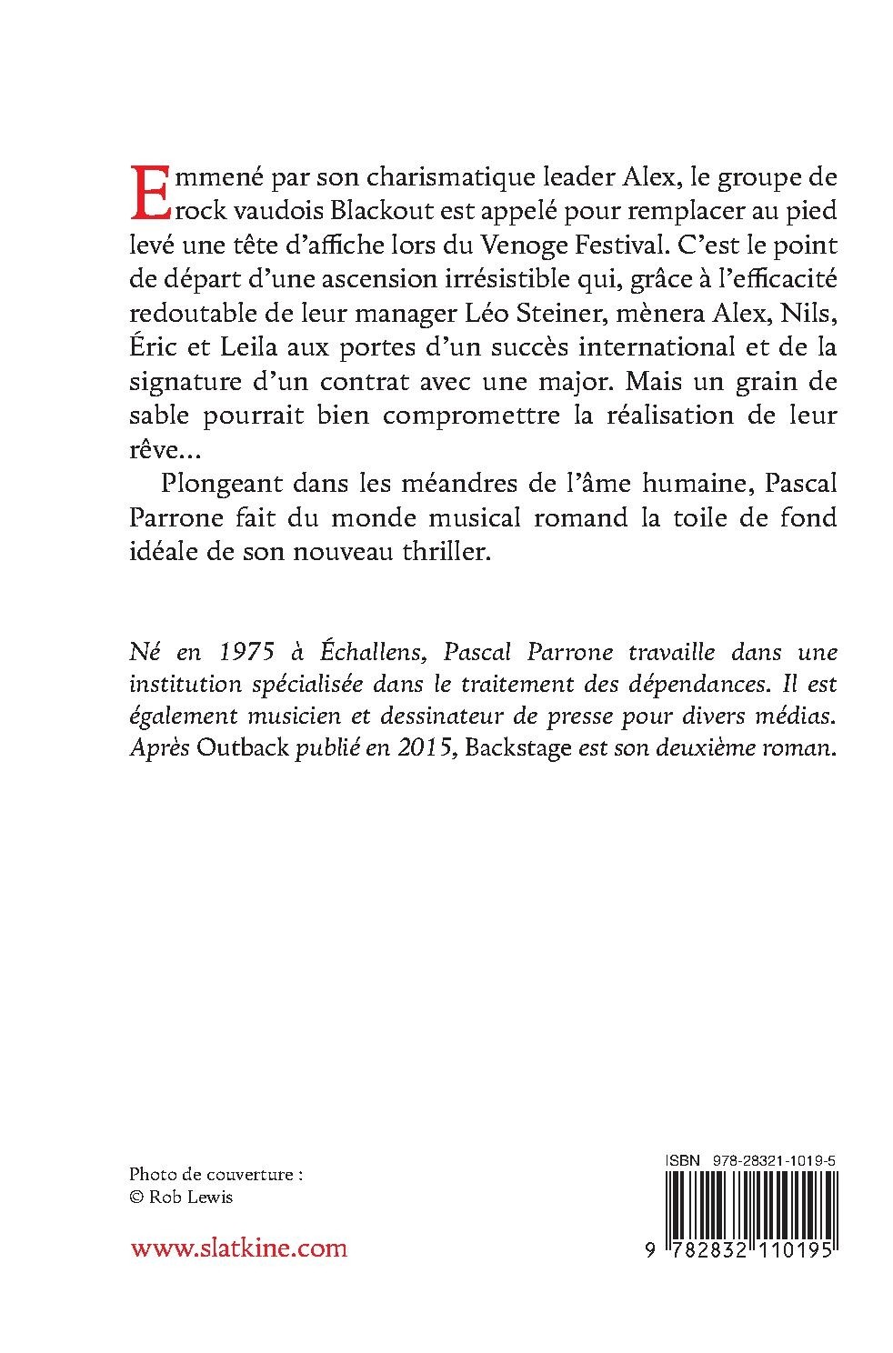 Né en 1975 à Échallens, Pascal Parrone travaille dans une institution spécialisée dans le traitement des dépendances. Il est également musicien et dessinateur de presse pour divers médias. Après Outback publié en 2015, Backstage est son deuxième roman.