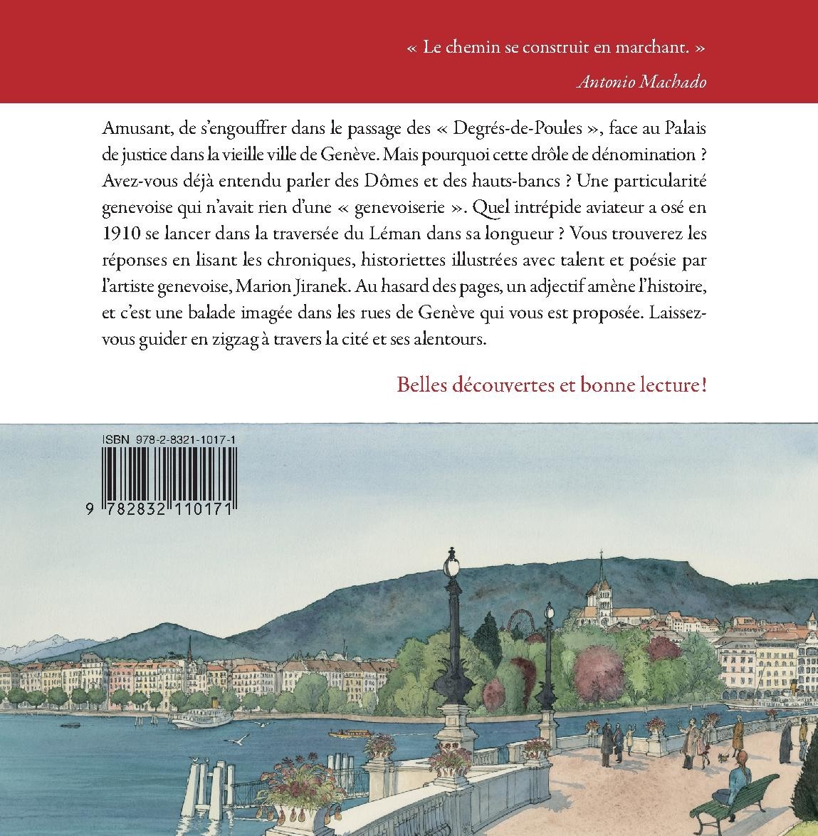 Amusant, de s’engouffrer dans le passage des «Degrés-de-Poules », face au Palais de justice dans la vieille ville de Genève. Mais pourquoi cette drôle de dénomination ? Avez-vous déjà entendu parler des Dômes et des hauts-bancs ? Une particularité genevoise qui n’avait rien d’une « genevoiserie ». Quel intrépide aviateur a osé en 1910 se lancer dans la traversée du Léman dans sa longueur ? Vous trouverez les réponses en lisant les chroniques, historiettes illustrées avec talent et poésie par l’artiste genevoise, Marion Jiranek. Au hasard des pages, un adjectif amène l’histoire, et c’est une balade imagée dans les rues de Genève qui vous est proposée. Laissez-vous guider en zigzag à travers la cité et ses alentours.