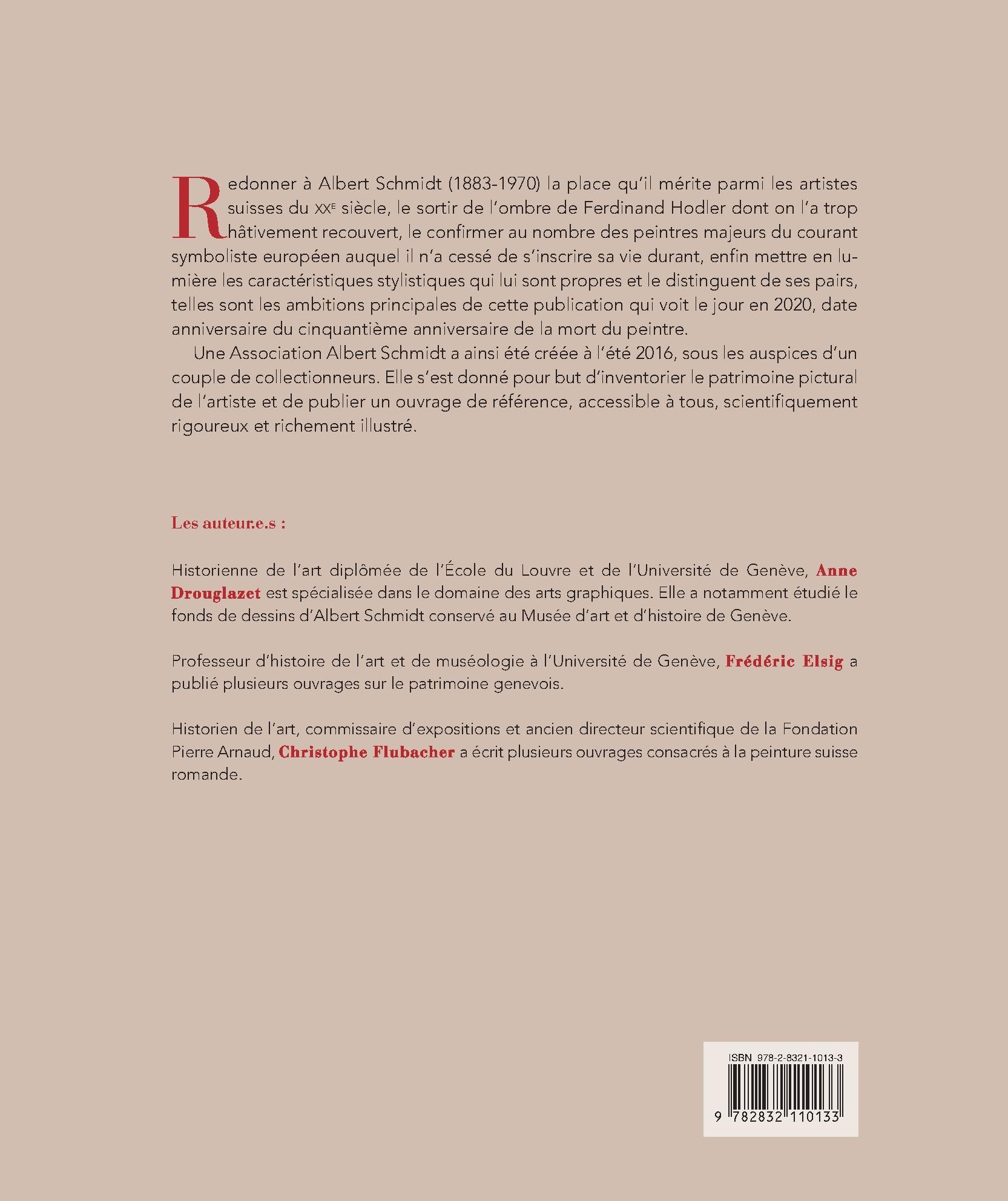 Redonner à Albert Schmidt (1883-1970) la place qu’il mérite parmi les artistes suisses du XXe siècle, le sortir de l’ombre de Ferdinand Hodler dont on l’a trop hâtivement recouvert, le confirmer au nombre des peintres majeurs du courant symboliste européen auquel il n’a cessé de s’inscrire sa vie durant, enfin mettre en lumière les caractéristiques stylistiques qui lui sont propres et le distinguent de ses pairs, telles sont les ambitions principales de cette publication qui voit le jour en 2020, date anniversaire du cinquantième anniversaire de la mort du peintre.