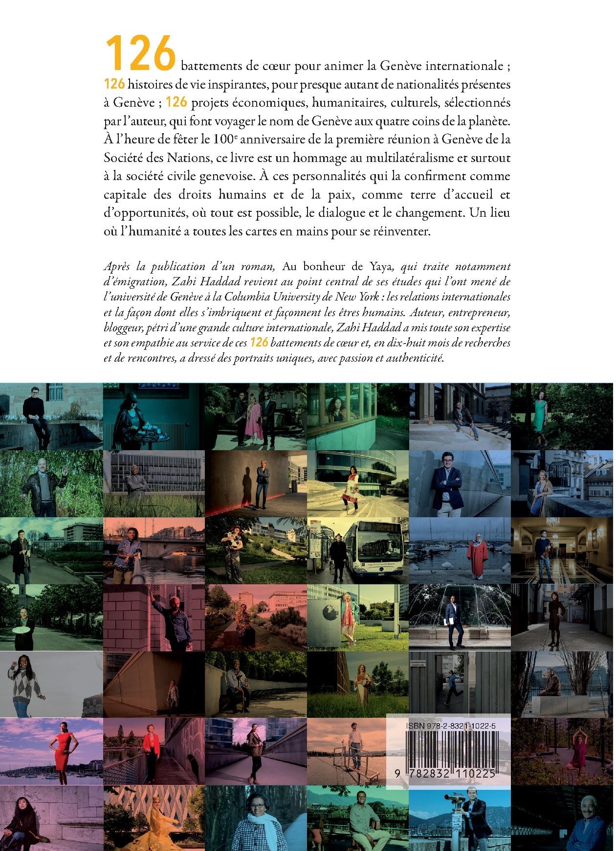 126 battements de coeur pour animer la Genève internationale; 126 histoires de vie inspirantes, pour presque autant de nationalités présentes à Genève ; 126 projets économiques, humanitaires, culturels, sélectionnés par l’auteur, qui font voyager le nom de Genève aux quatre coins de la planète. À l’heure de fêter le 100e anniversaire de la première réunion à Genève de la Société des Nations, ce livre est un hommage au multilatéralisme et surtout à la société civile genevoise. À ces personnalités qui la confirment comme capitale des droits humains et de la paix, comme terre d’accueil et d’opportunités, où tout est possible, le dialogue et le changement. Un lieu où l’humanité a toutes les cartes en mains pour se réinventer.