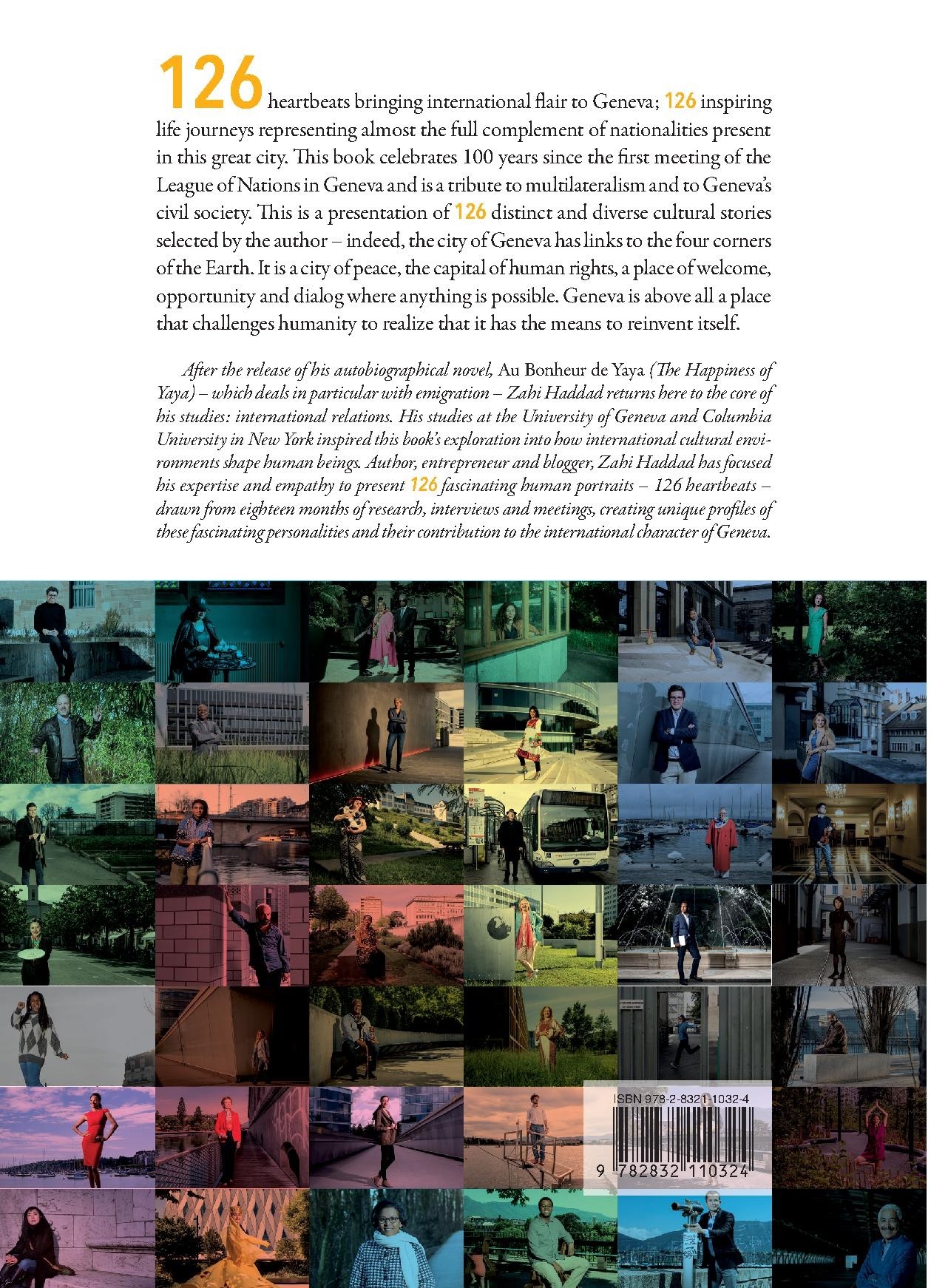 After the release of his autobiographical novel, Au Bonheur de Yaya (The Happiness of Yaya) – which deals in particular with emigration – Zahi Haddad returns here to the core of his studies: international relations. His studies at the University of Geneva and Columbia University in New York inspired this book’s exploration into how international cultural environments shape human beings. Author, entrepreneur and blogger, Zahi Haddad has focused his expertise and empathy to present 126 fascinating human portraits – 126 heartbeats – drawn from eighteen months of research, interviews and meetings, creating unique profiles of these fascinating personalities and their contribution to the international character of Geneva.