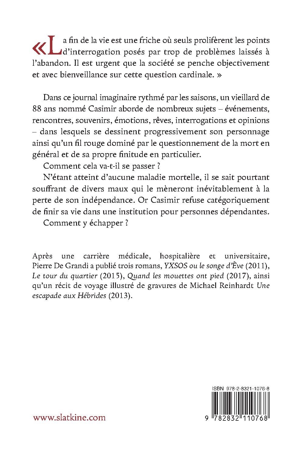 Dans ce journal imaginaire rythmé par les saisons, un vieillard de 88 ans nommé Casimir aborde de nombreux sujets – événements, rencontres, souvenirs, émotions, rêves, interrogations et opinions – dans lesquels se dessinent progressivement son personnage ainsi qu’un fil rouge dominé par le questionnement de la mort en général et de sa propre finitude en particulier.