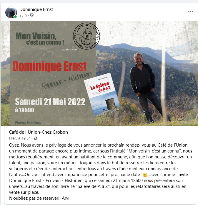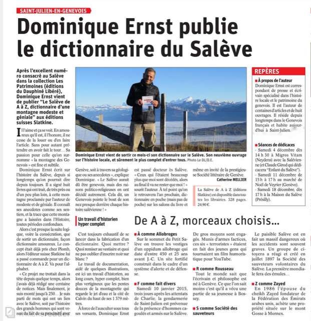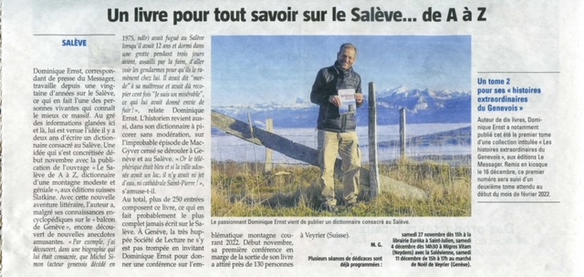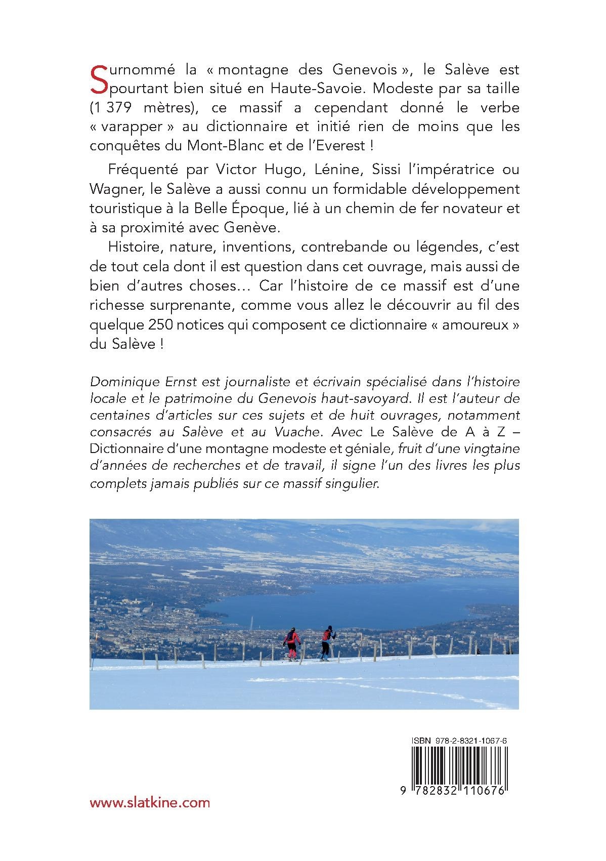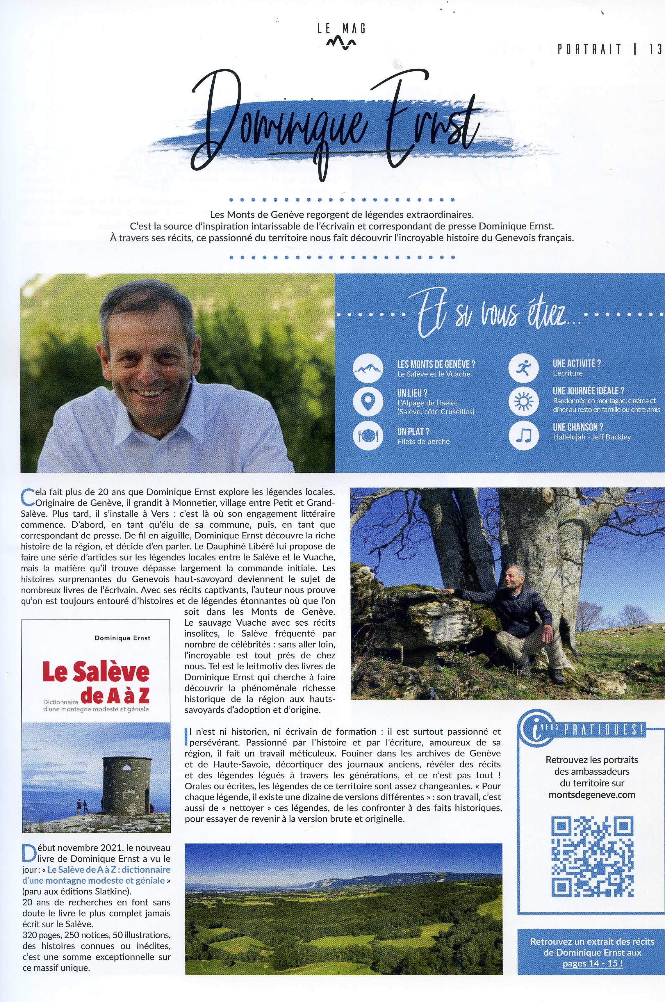 Dominique Ernst est journaliste et écrivain spécialisé dans l’histoire locale et le patrimoine du Genevois haut-savoyard. Il est l’auteur de centaines d’articles sur ces sujets et de huit ouvrages, notamment consacrés au Salève et au Vuache. Avec Le Salève de A à Z – Dictionnaire d’une montagne modeste et géniale, fruit d’une vingtaine d’années de recherches et de travail, il signe l’un des livres les plus complets jamais publiés sur ce massif singulier.