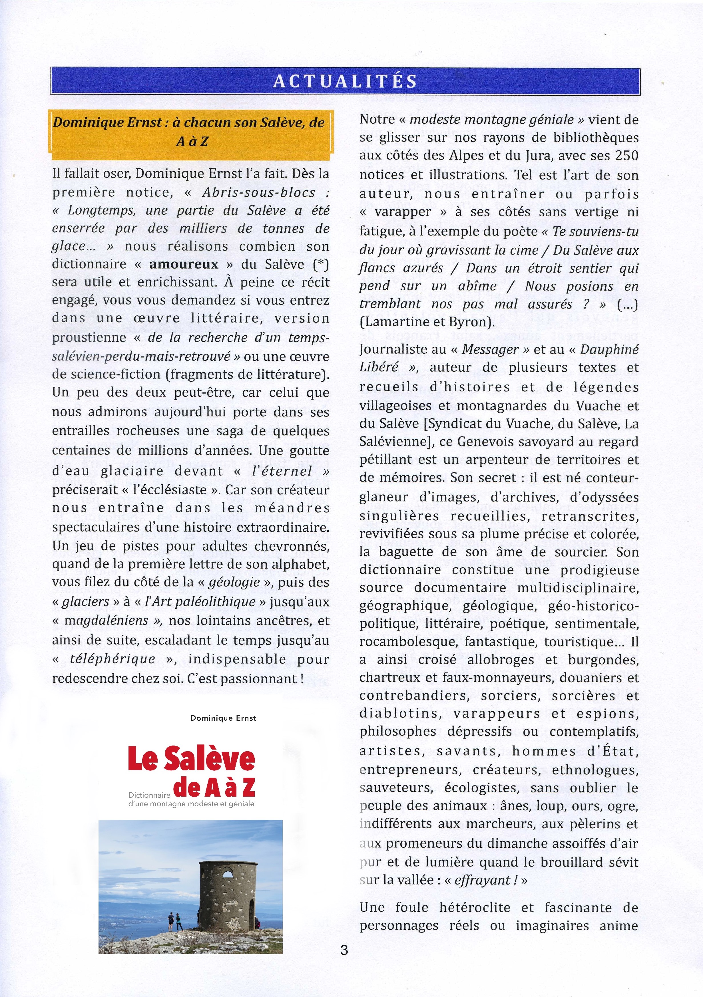 Histoire, nature, inventions, contrebande ou légendes, c’est de tout cela dont il est question dans cet ouvrage, mais aussi de bien d’autres choses… Car l’histoire de ce massif est d’une richesse surprenante, comme vous allez le découvrir au fil des quelque 250 notices qui composent ce dictionnaire « amoureux » du Salève !