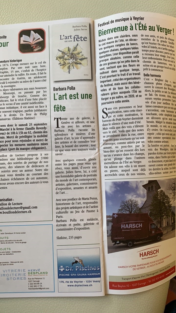 Trente ans de galerie, à Genève et ailleurs, et une vie avec les artistes : Barbara Polla raconte les splendeurs et misères d’une galerie d’art, la joie d’apprendre des artistes et de connaître leurs âmes, la beauté des oeuvres : tout ce que vous avez toujours voulu savoir… Avec quelques conseils glissés entre les pages pour vous qui rêvez, vous aussi, d’ouvrir une galerie. Julien Serve, lui, a créé une formidable galerie de portraits du monde de l’art contemporain, artistes, galeristes, commissaires d’exposition, amantes et amants de l’art…