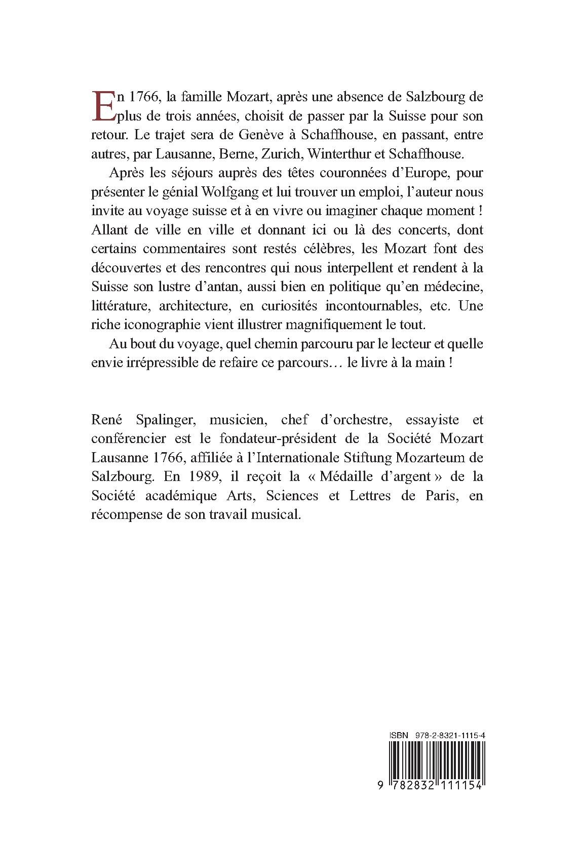 Après les séjours auprès des têtes couronnées d’Europe, pour présenter le génial Wolfgang et lui trouver un emploi, l’auteur nous invite au voyage suisse et à en vivre ou imaginer chaque moment ! Allant de ville en ville et donnant ici ou là des concerts, dont certains commentaires sont restés célèbres, les Mozart font des découvertes et des rencontres qui nous interpellent et rendent à la Suisse son lustre d’antan, aussi bien en politique qu’en médecine, littérature, architecture, en curiosités incontournables, etc. Une riche iconographie vient illustrer magnifiquement le tout.