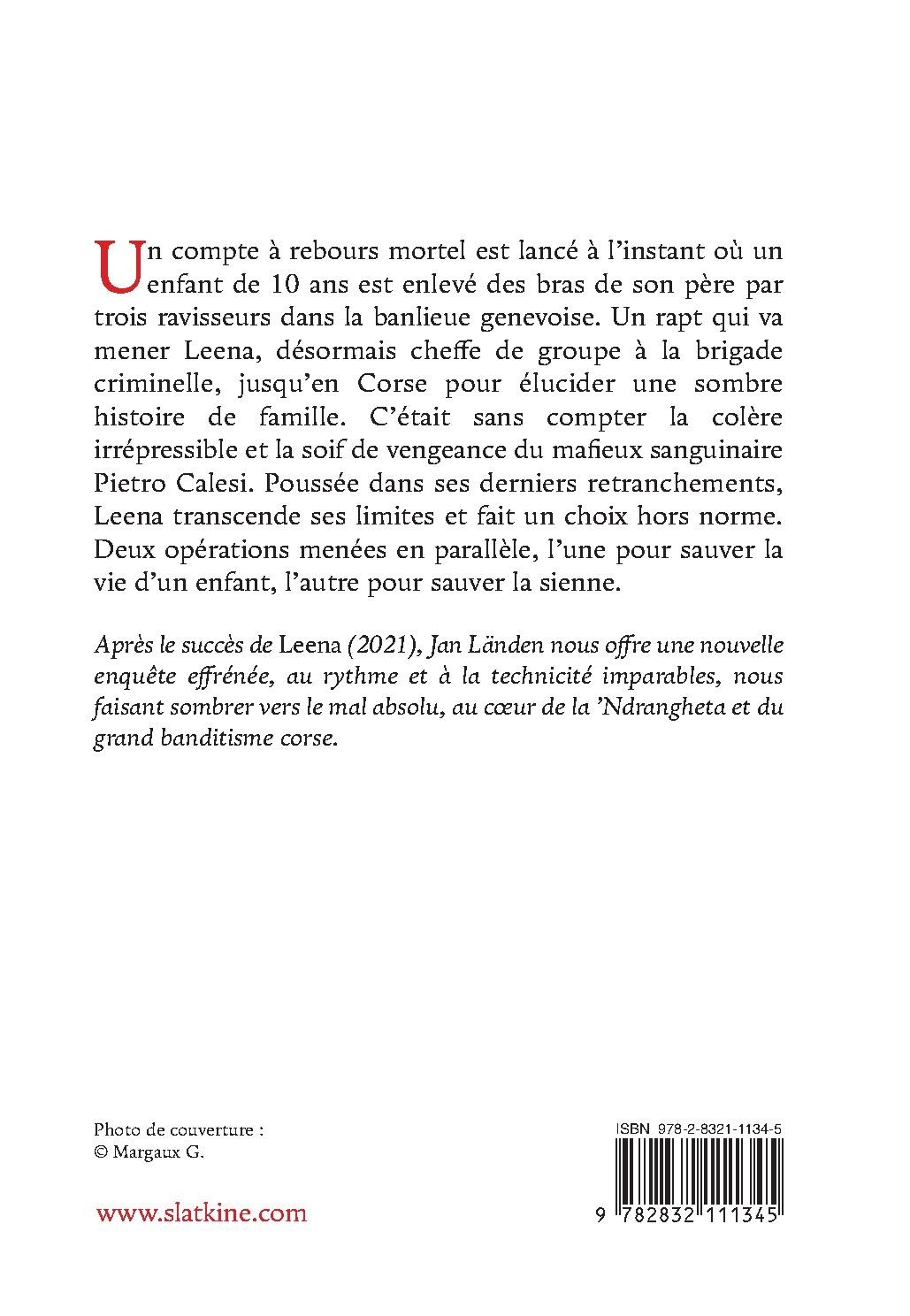 Un compte à rebours mortel est lancé à l’instant où un enfant de 10 ans est enlevé des bras de son père par trois ravisseurs dans la banlieue genevoise. Un rapt qui va mener Leena, désormais cheffe de groupe à la brigade criminelle, jusqu’en Corse pour élucider une sombre histoire de famille. C’était sans compter la colère irrépressible et la soif de vengeance du mafieux sanguinaire Pietro Calesi. Poussée dans ses derniers retranchements, Leena transcende ses limites et fait un choix hors norme.
