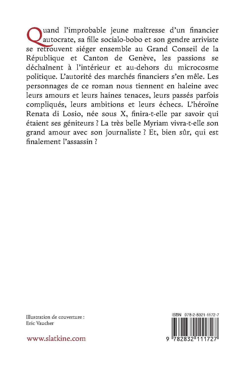 Quand l’improbable jeune maîtresse d’un financier autocrate, sa fille socialo-bobo et son gendre arriviste se retrouvent siéger ensemble au Grand Conseil de la République et Canton de Genève, les passions se déchaînent à l’intérieur et au-dehors du microcosme politique. L’autorité des marchés financiers s’en mêle. Les personnages de ce roman nous tiennent en haleine avec leurs amours et leurs haines tenaces, leurs passés parfois compliqués, leurs ambitions et leurs échecs. L’héroïne Renata di Losio, née sous X, finira-t-elle par savoir qui étaient ses géniteurs ? La très belle Myriam vivra-t-elle son grand amour avec son journaliste ? Et, bien sûr, qui est finalement l’assassin ?