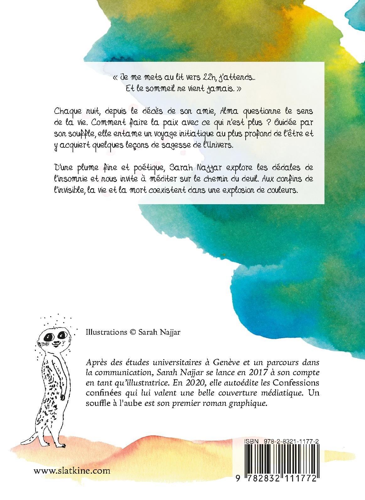 Après des études universitaires à Genève et un parcours dans la communication, Sarah Najjar se lance en 2017 à son compte en tant qu’illustratrice. En 2020, elle autoédite les Confessions confinées qui lui valent une belle couverture médiatique. Un souffle à l'aube est son premier roman graphique.