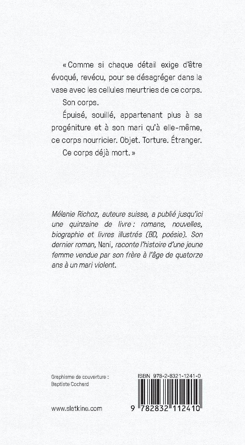 Mélanie Richoz, auteure suisse, a publié jusqu’ici une quinzaine de livres : romans, nouvelles, biographie et livres illustrés (BD, poésie). Son dernier roman, Nani, raconte l’histoire d’une jeune femme vendue par son frère à l’âge de quatorze ans à un mari violent.
