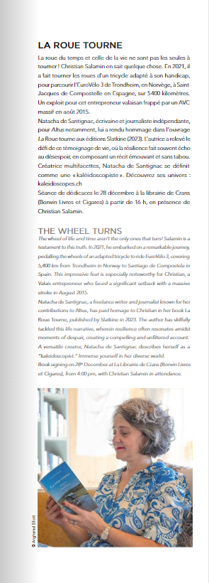Personnalité plurielle, Natacha de Santignac, Française et Anglaise venue de Lille à Genève en 2001, est historienne de formation. Depuis 2016, elle exerce en tant que journaliste indépendante. Maintenant installée en Chablais, elle contribue à La Vie à Crans-Montana au Point Chablais en passant par Altus Magazine ou encore Select. Passionnée par autrui, elle accepte d’écrire le récit de vie de Christian Salamin juste après la parution de son premier roman « Elles ». L’écriture lui permet de porter un certain regard sur le monde tout comme ses photographies ou ses podcasts.