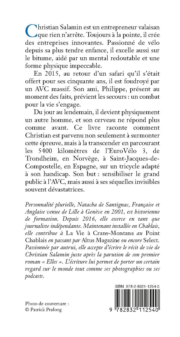 Du jour au lendemain, il devient physiquement un autre homme, et son cerveau ne répond plus comme avant. Ce livre raconte comment Christian est parvenu non seulement à surmonter cette épreuve, mais à la transcender en parcourant les 5400 kilomètres de l’EuroVélo 3, de Trondheim, en Norvège, à Saint-Jacques-de-Compostelle, en Espagne, sur un tricycle adapté à son handicap. Son but : sensibiliser le grand public à l’AVC, mais aussi à ses séquelles invisibles souvent dévastatrices.