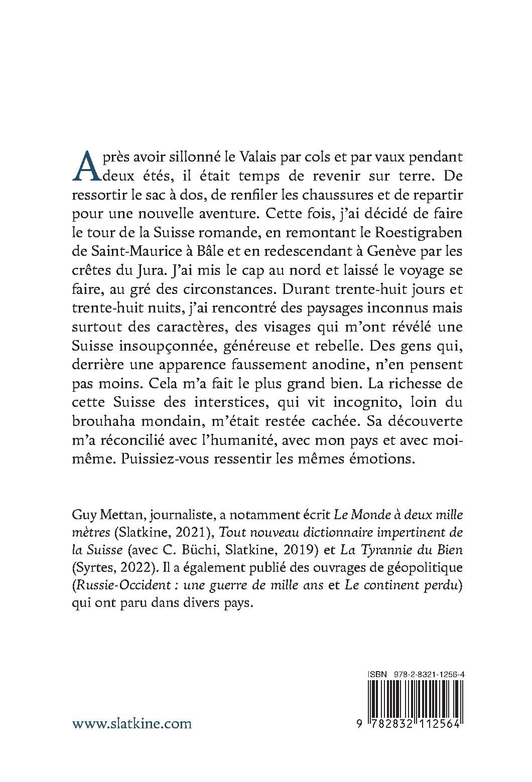 Après avoir sillonné le Valais par cols et par vaux pendant deux étés, il était temps de revenir sur terre. De ressortir le sac à dos, de renfiler les chaussures et de repartir pour une nouvelle aventure. Cette fois, j’ai décidé de faire le tour de la Suisse romande, en remontant le Roestigraben de Saint-Maurice à Bâle et en redescendant à Genève par les crêtes du Jura. J’ai mis le cap au nord et laissé le voyage se faire, au gré des circonstances. Durant trente-huit jours et trente-huit nuits, j’ai rencontré des paysages inconnus mais surtout des caractères, des visages qui m’ont révélé une Suisse insoupçonnée, généreuse et rebelle. Des gens qui, derrière une apparence faussement anodine, n’en pensent pas moins. Cela m’a fait le plus grand bien. La richesse de cette Suisse des interstices, qui vit incognito, loin du brouhaha mondain, m’était restée cachée. Sa découverte m’a réconcilié avec l’humanité, avec mon pays et avec moi-même. Puissiez-vous ressentir les mêmes émotions.