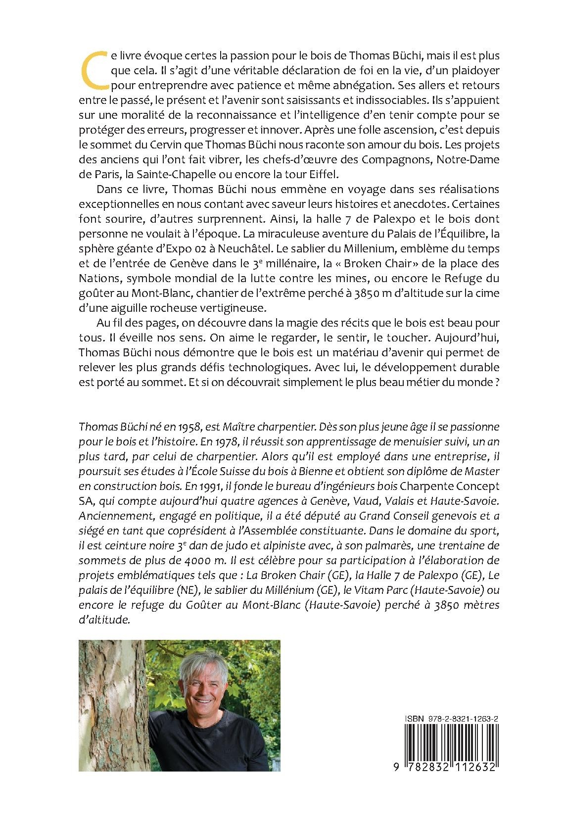 Ce livre évoque certes la passion pour le bois de Thomas Büchi, mais il est plus que cela. Il s’agit d’une véritable déclaration de foi en la vie, d’un plaidoyer pour entreprendre avec patience et même abnégation. Ses allers et retours entre le passé, le présent et l’avenir sont saisissants et indissociables. Ils s’appuient sur une moralité de la reconnaissance et l’intelligence d’en tenir compte pour se protéger des erreurs, progresser et innover. Après une folle ascension, c’est depuis le sommet du Cervin que Thomas Büchi nous raconte son amour du bois. Les projets des anciens qui l’ont fait vibrer, les chefs-d’oeuvre des Compagnons, Notre-Dame de Paris, la Sainte-Chapelle ou encore la tour Eiffel.