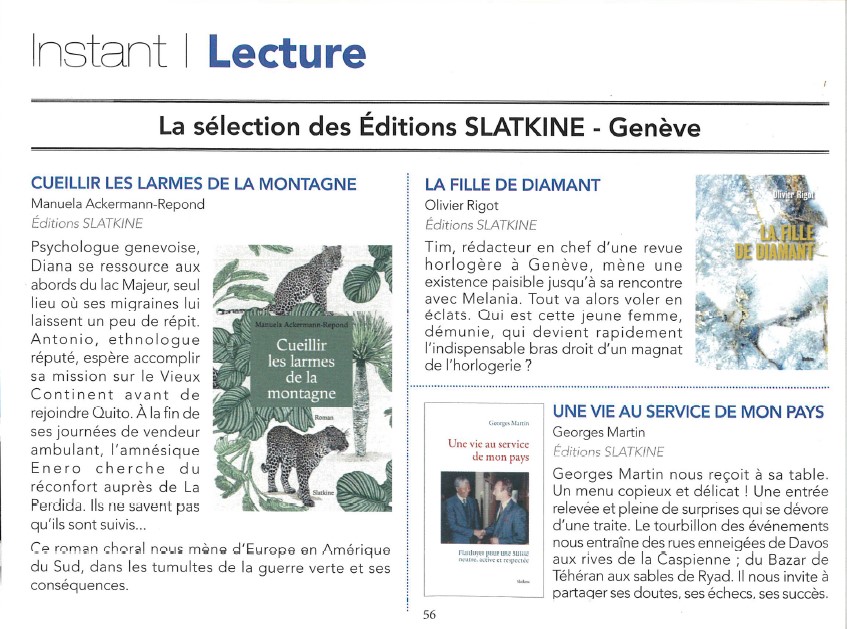 Manuela Ackermann-Repond se consacre à l’écriture sous tous ses aspects. Dans ses textes, elle explore les relations humaines, questionne le déni et effleure le hasard. Elle est l’auteure de La capeline écarlate (Slatkine, 2017) et L’âme déracinée (Slatkine, 2019).