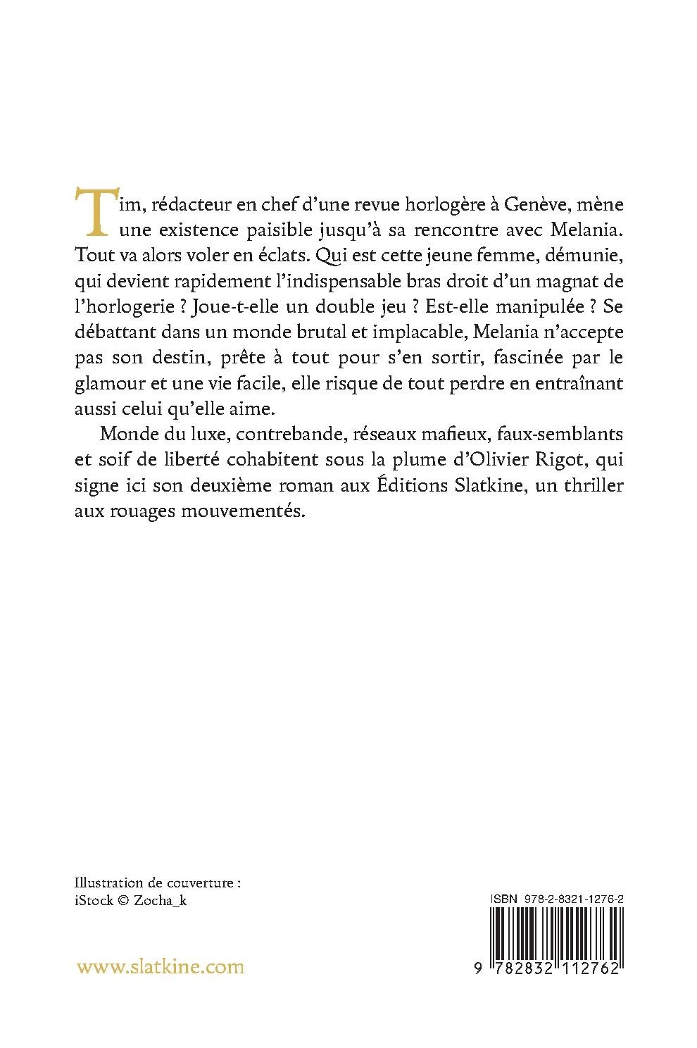 Tim, rédacteur en chef d’une revue horlogère à Genève, mène une  existence paisible jusqu’à sa rencontre avec Melania. Tout va alors  voler en éclats. Qui est cette jeune femme, démunie, qui devient  rapidement l’indispensable bras droit d’un magnat de l’horlogerie ?  Joue-t-elle un double jeu ? Est-elle manipulée ? Se débattant dans  un monde brutal et implacable, Melania n’accepte pas son destin,  prête à tout pour s’en sortir, fascinée par le glamour et une vie  facile, elle risque de tout perdre en entraînant aussi celui qu’elle  aime.