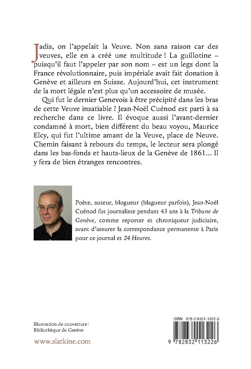 Qui fut le dernier Genevois à être précipité dans les bras de cette Veuve insatiable ? Jean-Noël Cuénod est parti à sa recherche dans ce livre. Il évoque aussi l’avant-dernier condamné à mort, bien différent du beau voyou, Maurice Elcy, qui fut l’ultime amant de la Veuve, place de Neuve. Chemin faisant à rebours du temps, le lecteur sera plongé dans les bas-fonds et hauts-lieux de la Genève de 1861… Il y fera de bien étranges rencontres.