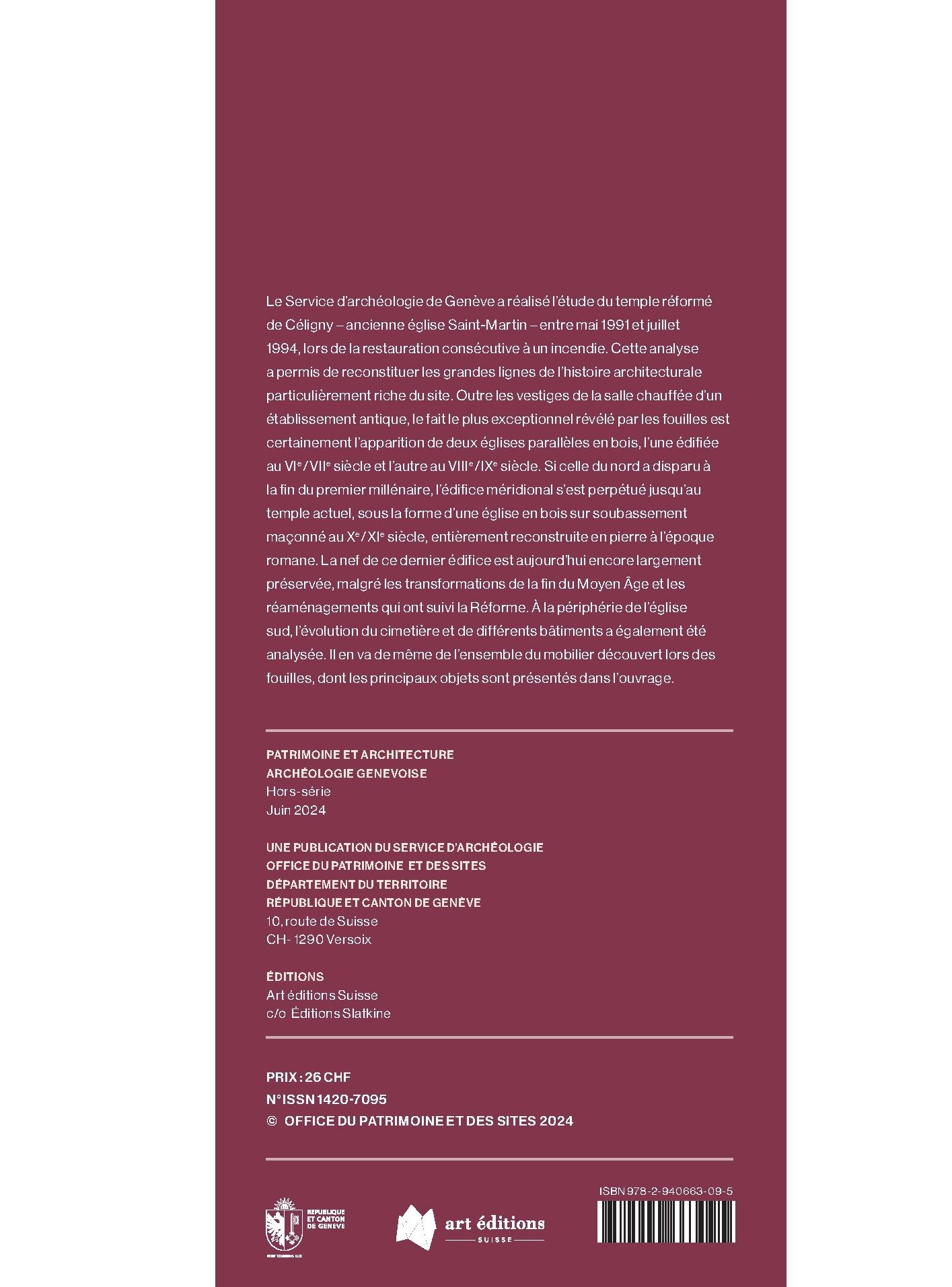 Le Service d’archéologie de Genève a réalisé l’étude du temple réformé de Céligny – ancienne église Saint-Martin – entre mai 1991 et juillet 1994, lors de la restauration consécutive à un incendie. Cette analyse a permis de reconstituer les grandes lignes de l’histoire architecturale particulièrement riche du site. Outre les vestiges de la salle chauffée d’un établissement antique, le fait le plus exceptionnel révélé par les fouilles est certainement l’apparition de deux églises parallèles en bois, l’une édifiée au VIe / VIIe siècle et l’autre au VIIIe / IXe siècle. Si celle du nord a disparu à la fin du premier millénaire, l’édifice méridional s’est perpétué jusqu’au temple actuel, sous la forme d’une église en bois sur soubassement maçonné au Xe / XIe siècle, entièrement reconstruite en pierre à l’époque romane. La nef de ce dernier édifice est aujourd’hui encore largement préservée, malgré les transformations de la fin du Moyen Âge et les réaménagements qui ont suivi la Réforme. À la périphérie de l’église sud, l’évolution du cimetière et de différents bâtiments a également été analysée. Il en va de même de l’ensemble du mobilier découvert lors des fouilles, dont les principaux objets sont présentés dans l’ouvrage.